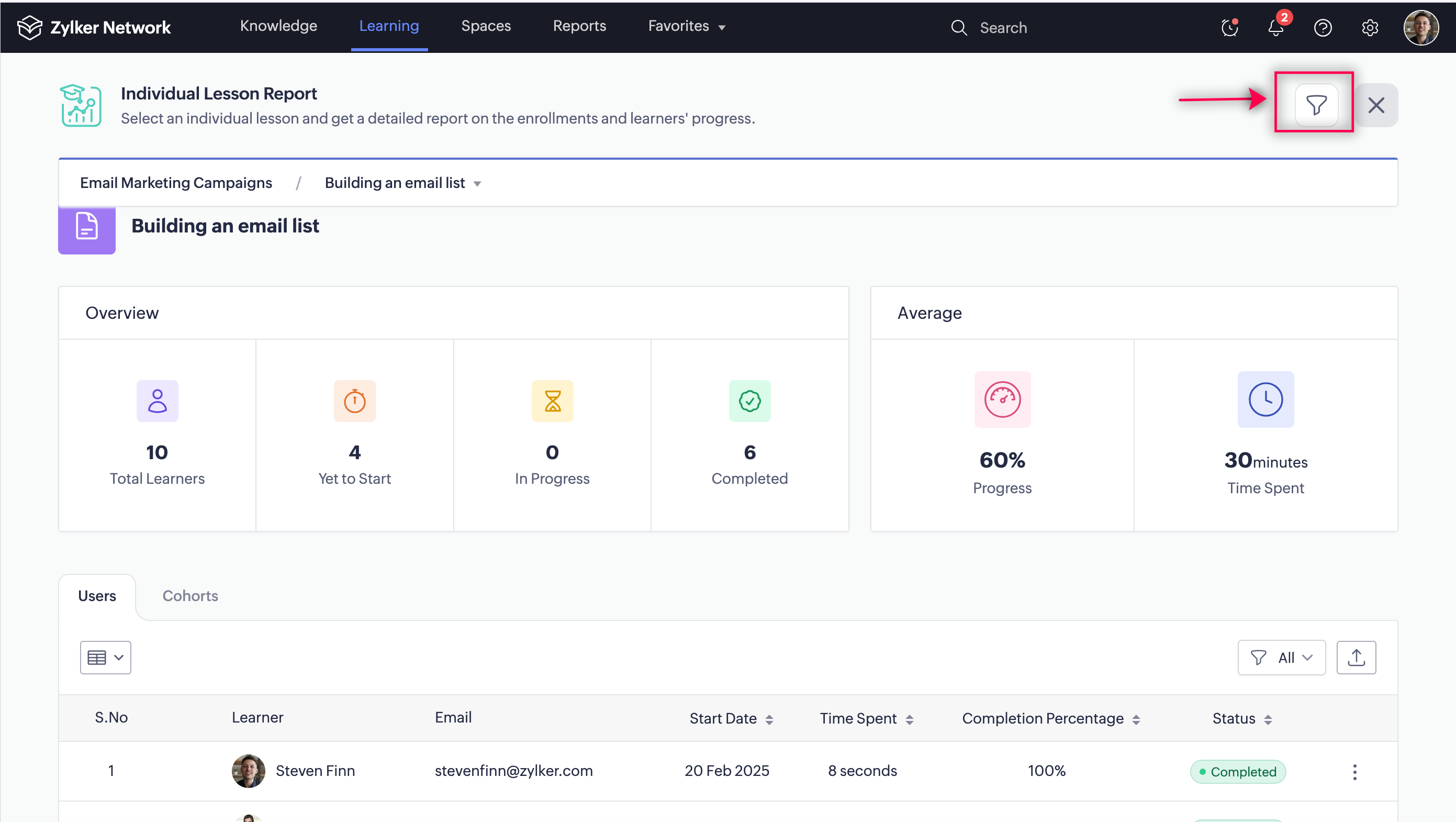 The Funnel tab shows the percentage of learners who have moved from one stage to another.You can filter out and view the list of learners in a specific stage with the help of Filter.