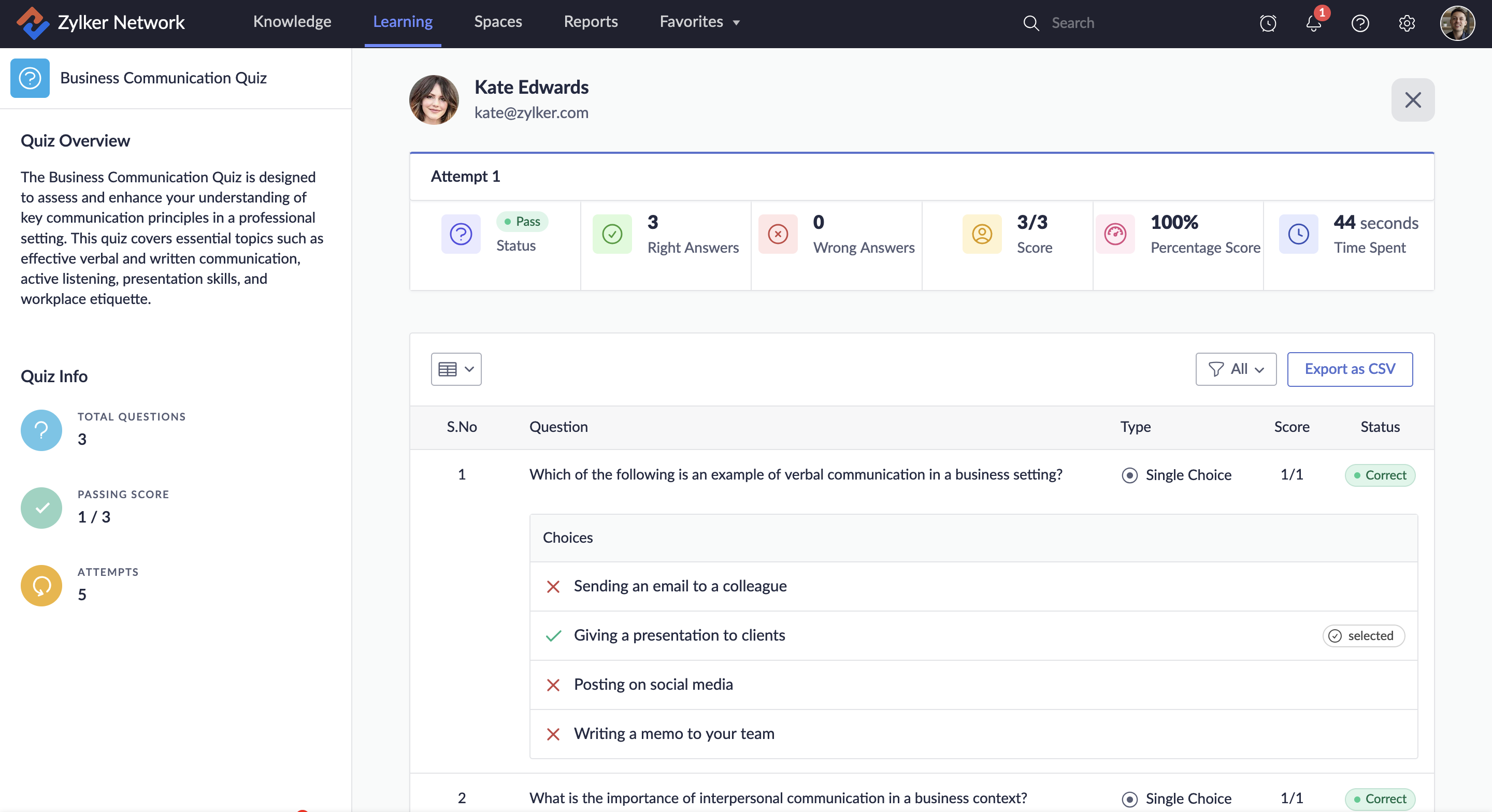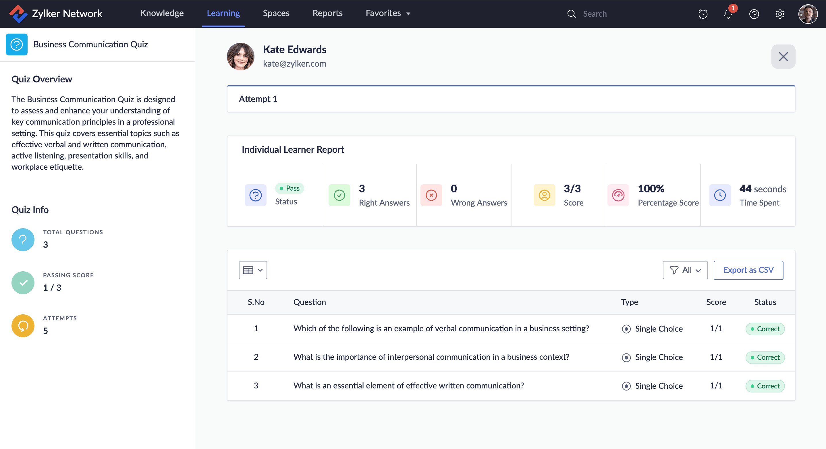 You can also view a more detailed individual learner report, showing the number of attempts made by each learner, their chosen answers for each question, the time spent by each learner, and more. This report can be used as a tool for providing feedback to the user. It can highlight their strengths and weaknesses and provide suggestions on how to improve their performance