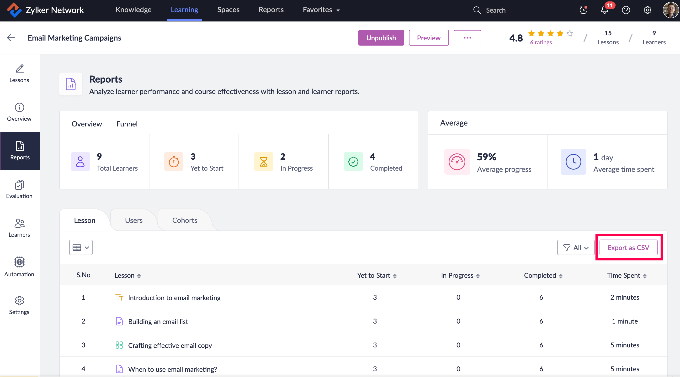 Once you click on Reports, you'll see a mini dashboard under the overview section. This will include the total number of learners who are a part of this course, the number of learners yet to start, and those who have already completed the course. On the right hand side, you'll find additional details such as the average time spent on the course and the average progress of learners.
