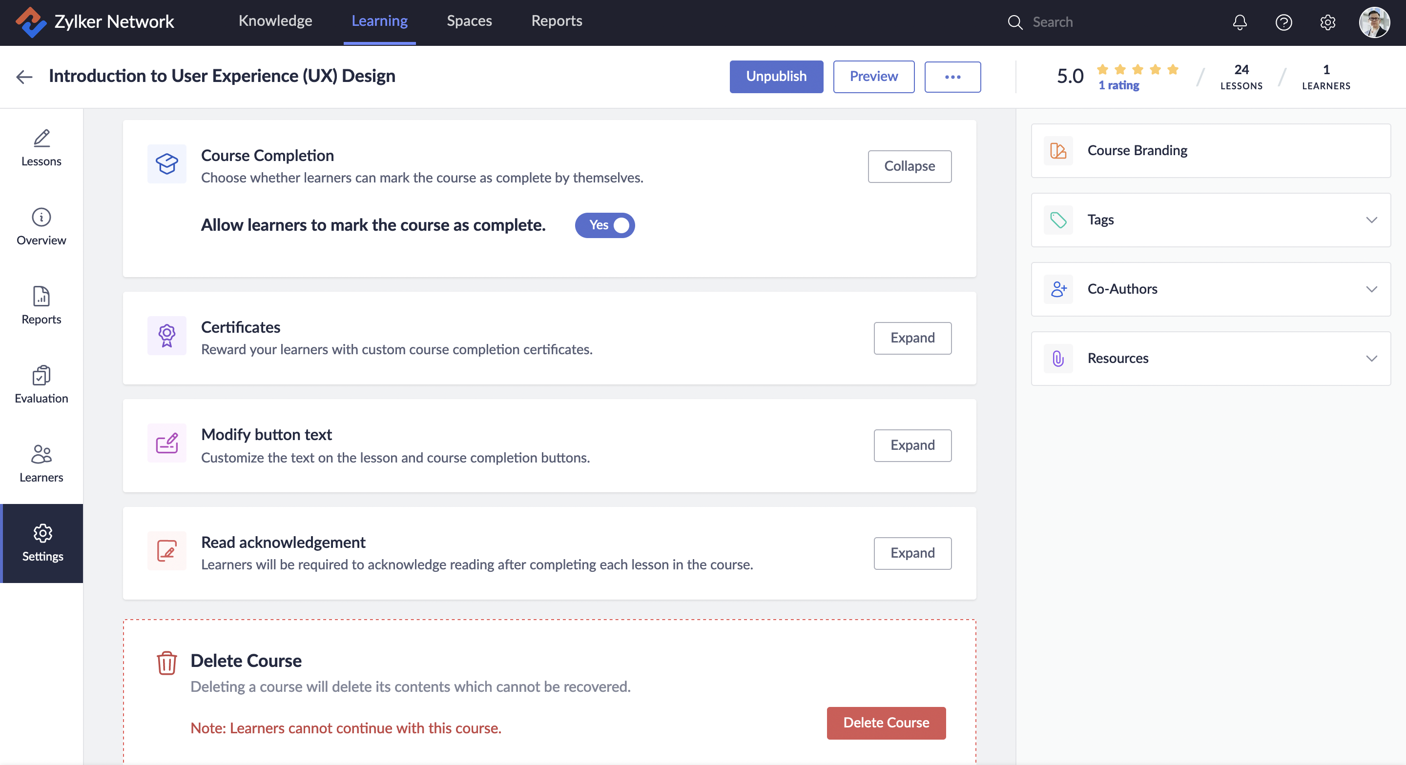 Replace the default text on the course and lesson completion buttons and add a customized text based on the requirements of your course. To modify completion buttons: Navigate to the course, then go to the Settings tab. Click the Expand button on the ...