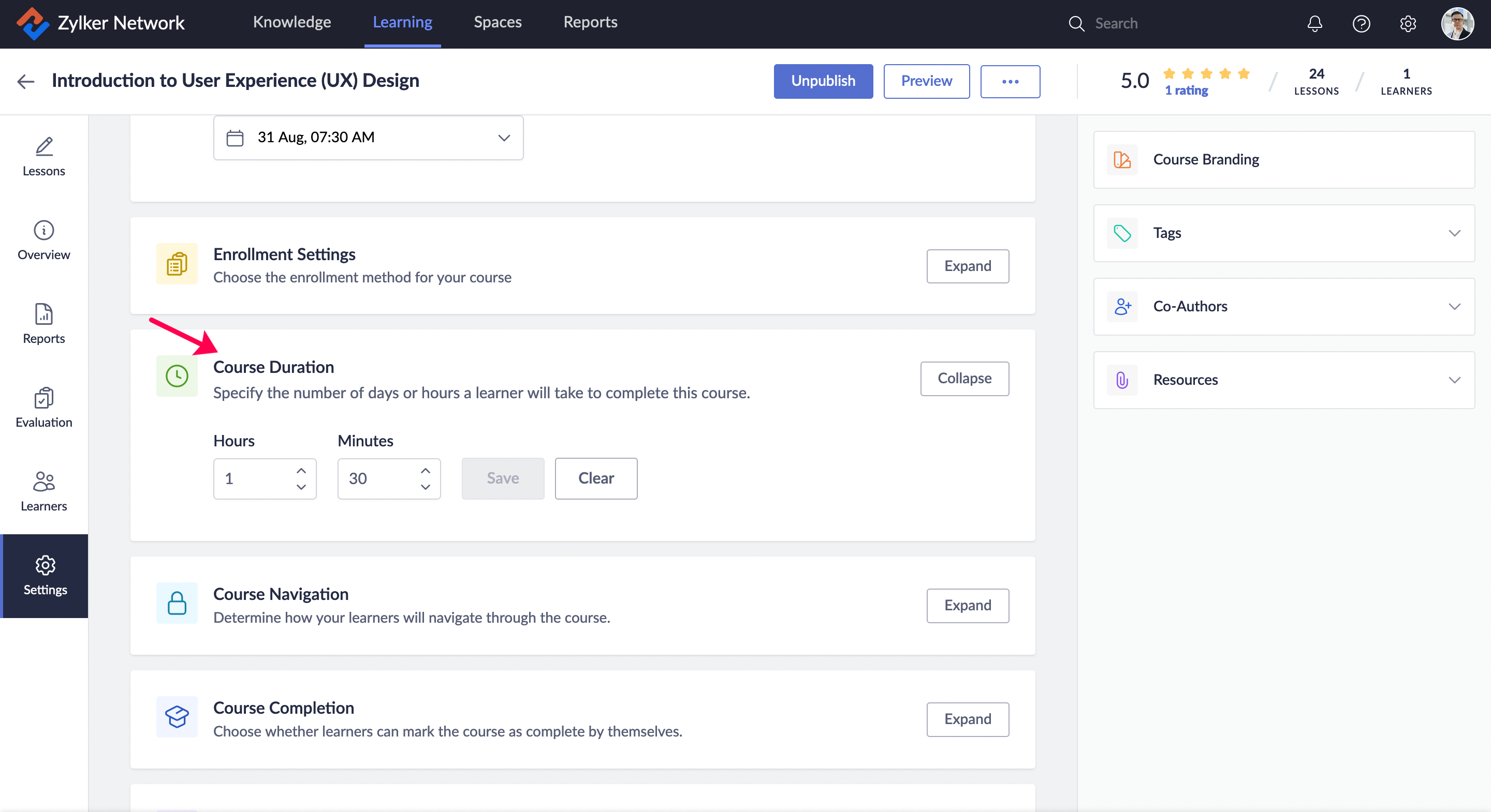 Course duration specifies the number of hours a learner will take to complete a course. Setting the course duration can help learners to estimate the time required to complete the course and plan their learning.