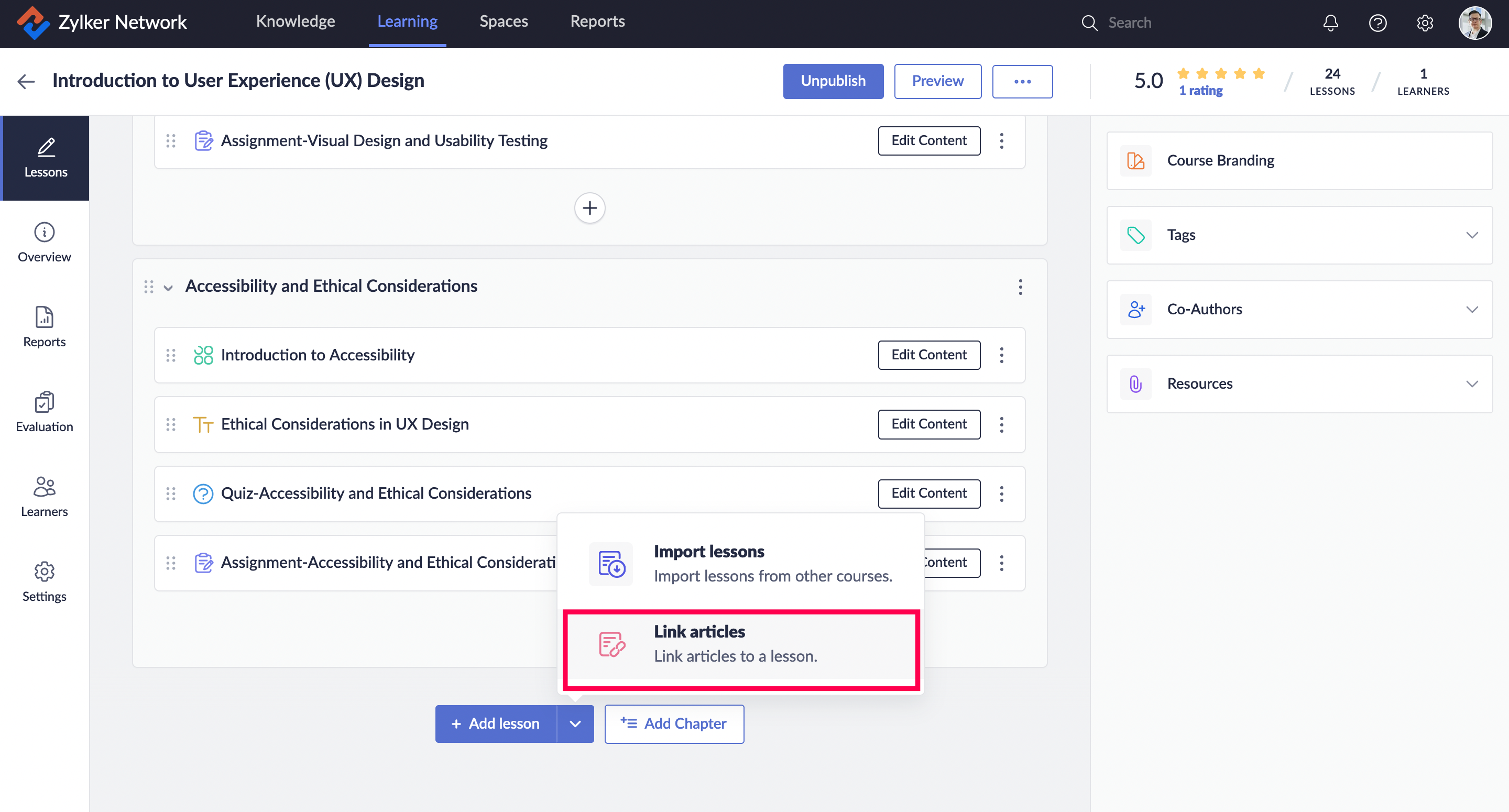 4. If the chapter, manual, or space that consists of articles linked to a course is deleted, the link will be removed automatically.