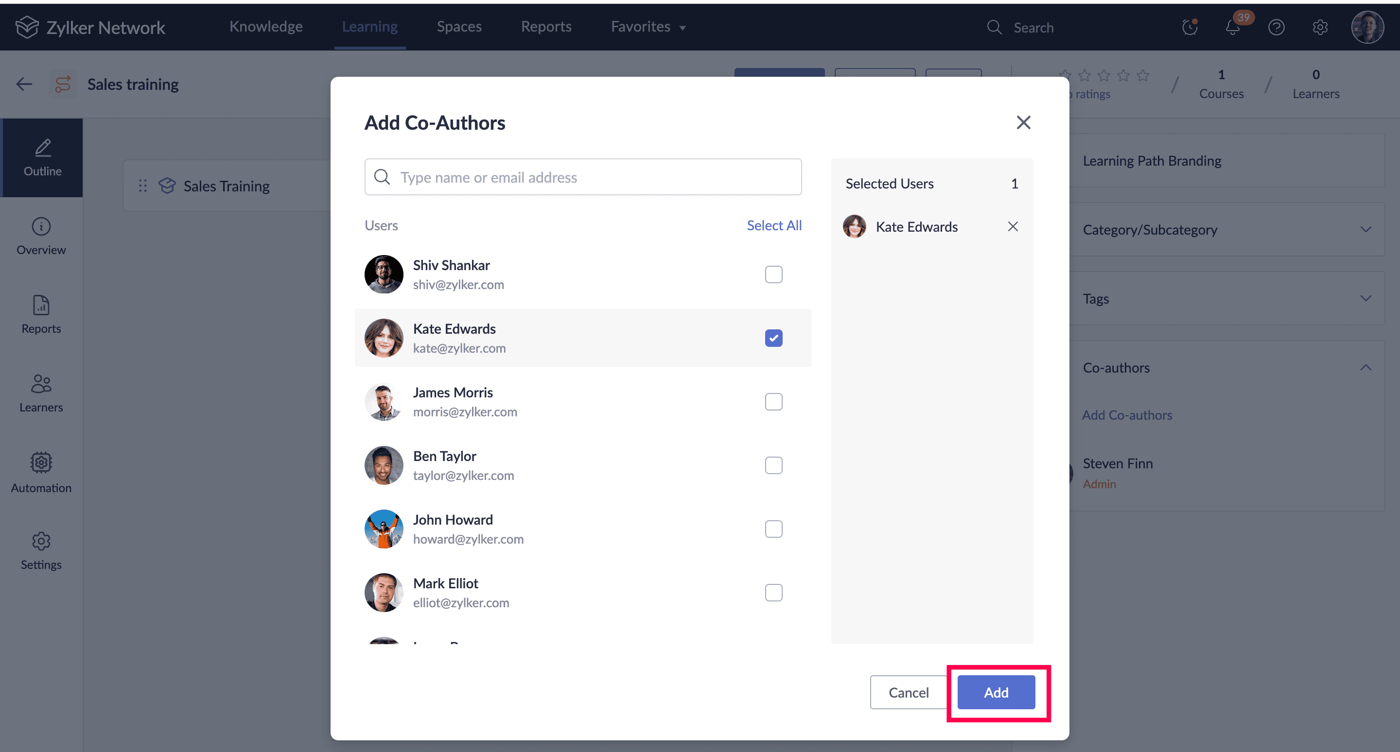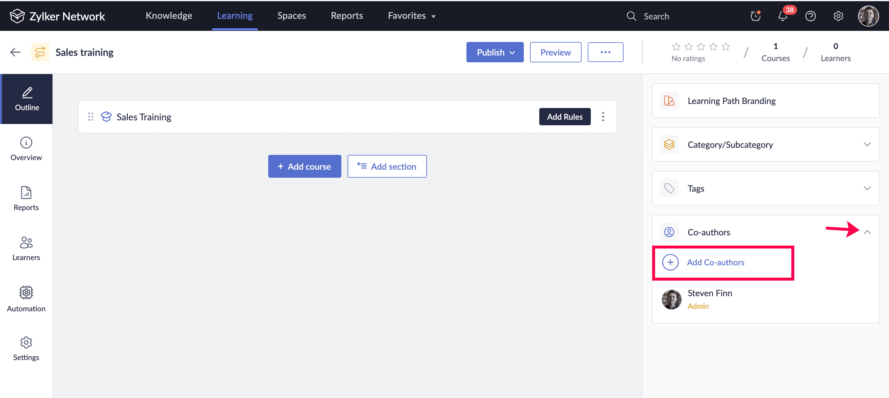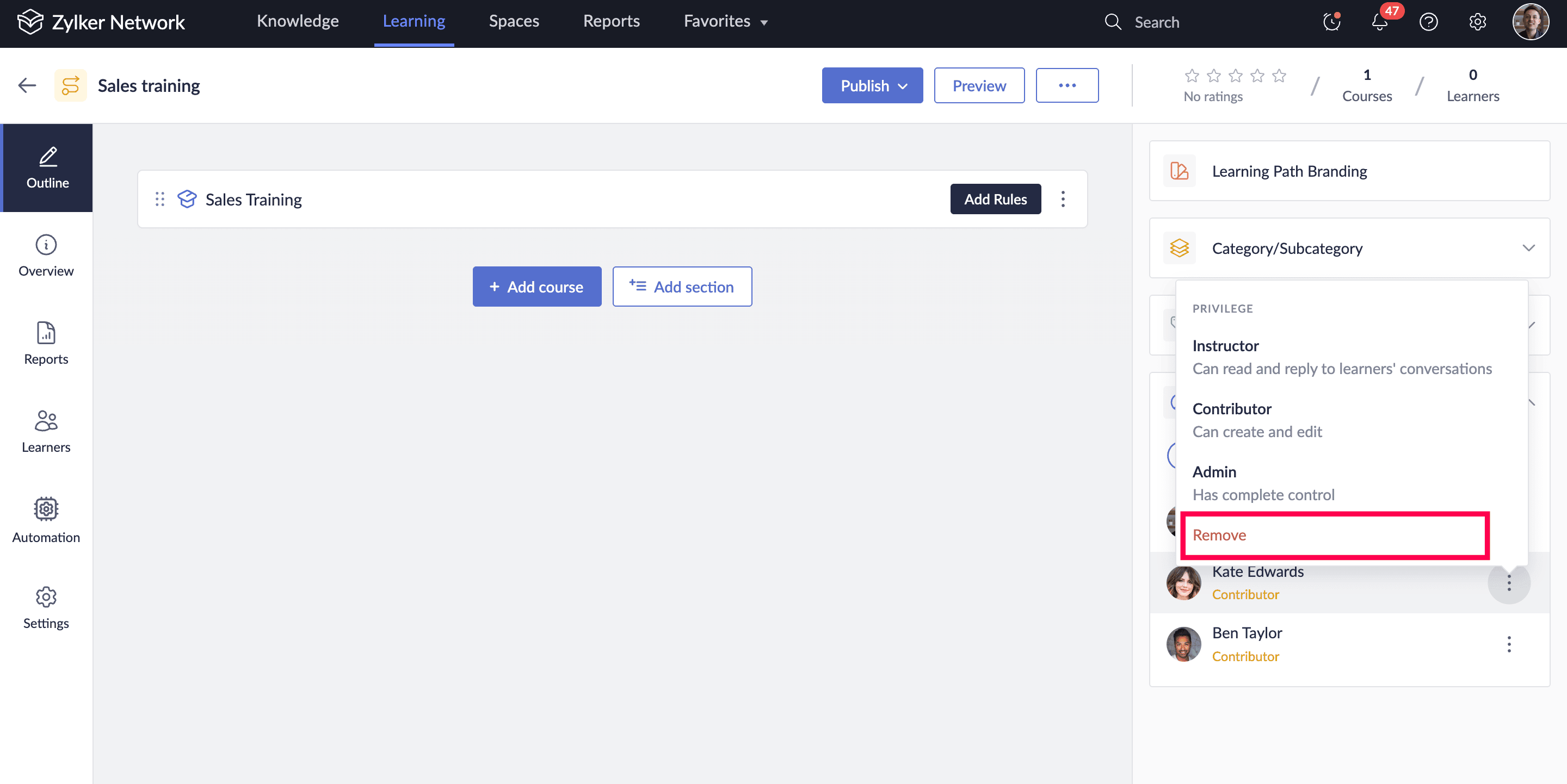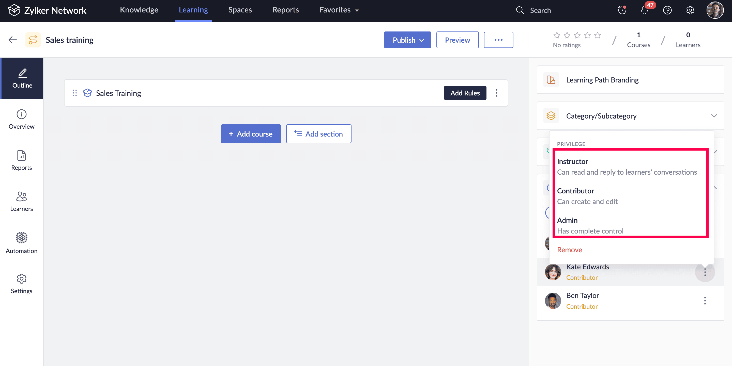 You can add co-authors to your learning paths. After course creation, admins can add co-authors to build and manage your courses together. Co-authors can have one of the following privileges: