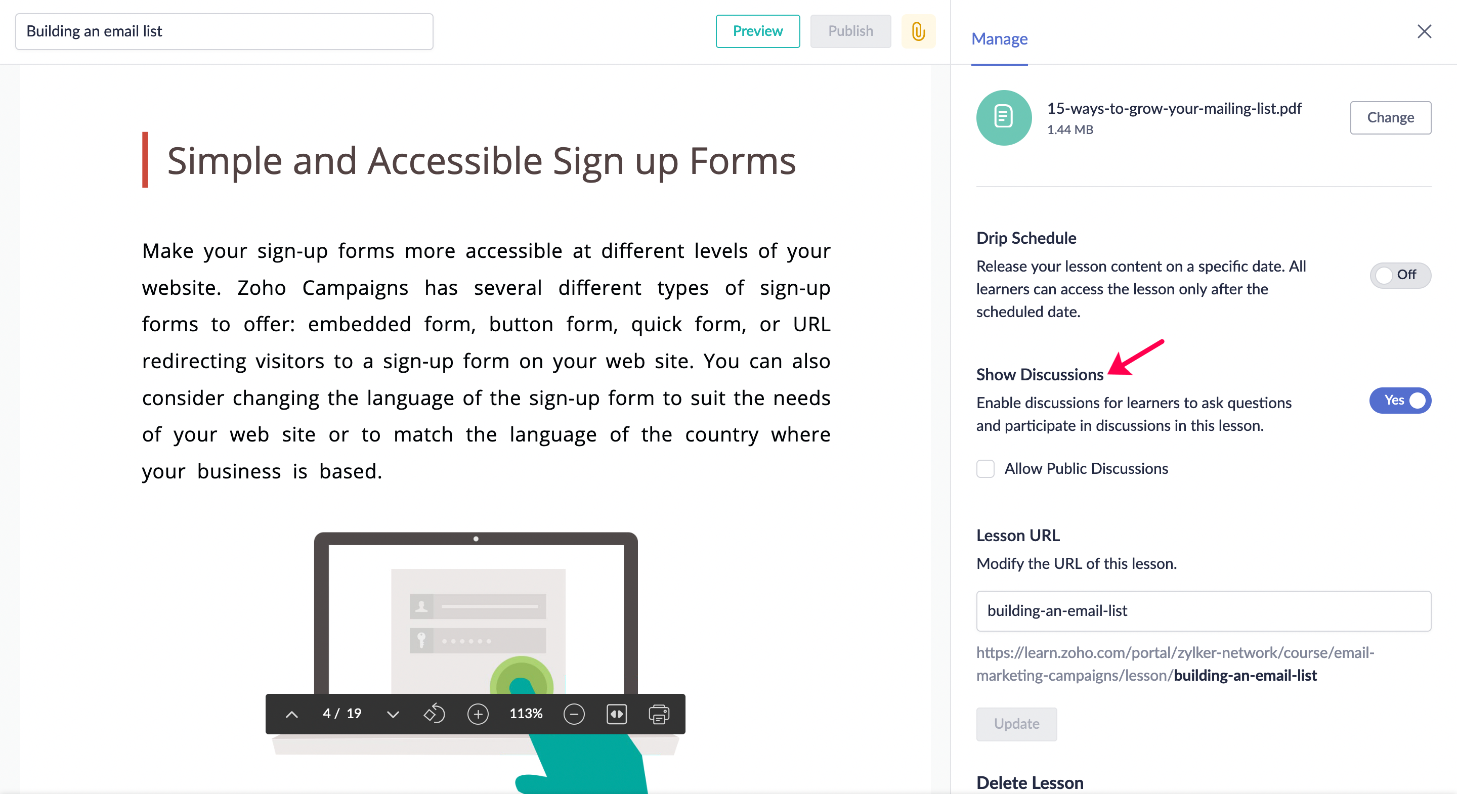 Drip schedule allows you to control the access of learners to your course content and plan the release of your lessons over a period of time. The content will be delivered in parts so that users don’t get it all at once. With drip schedule, you can ...