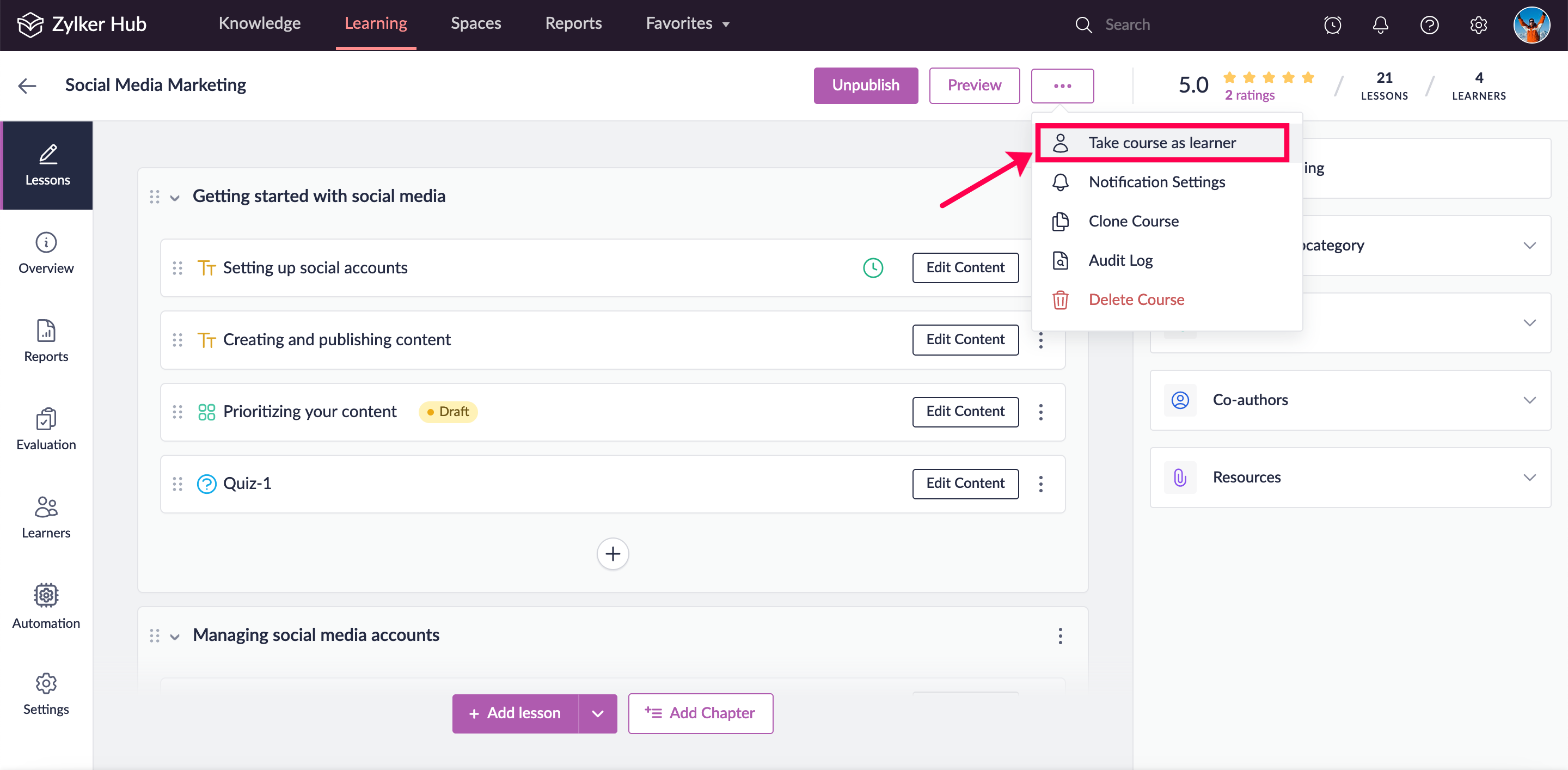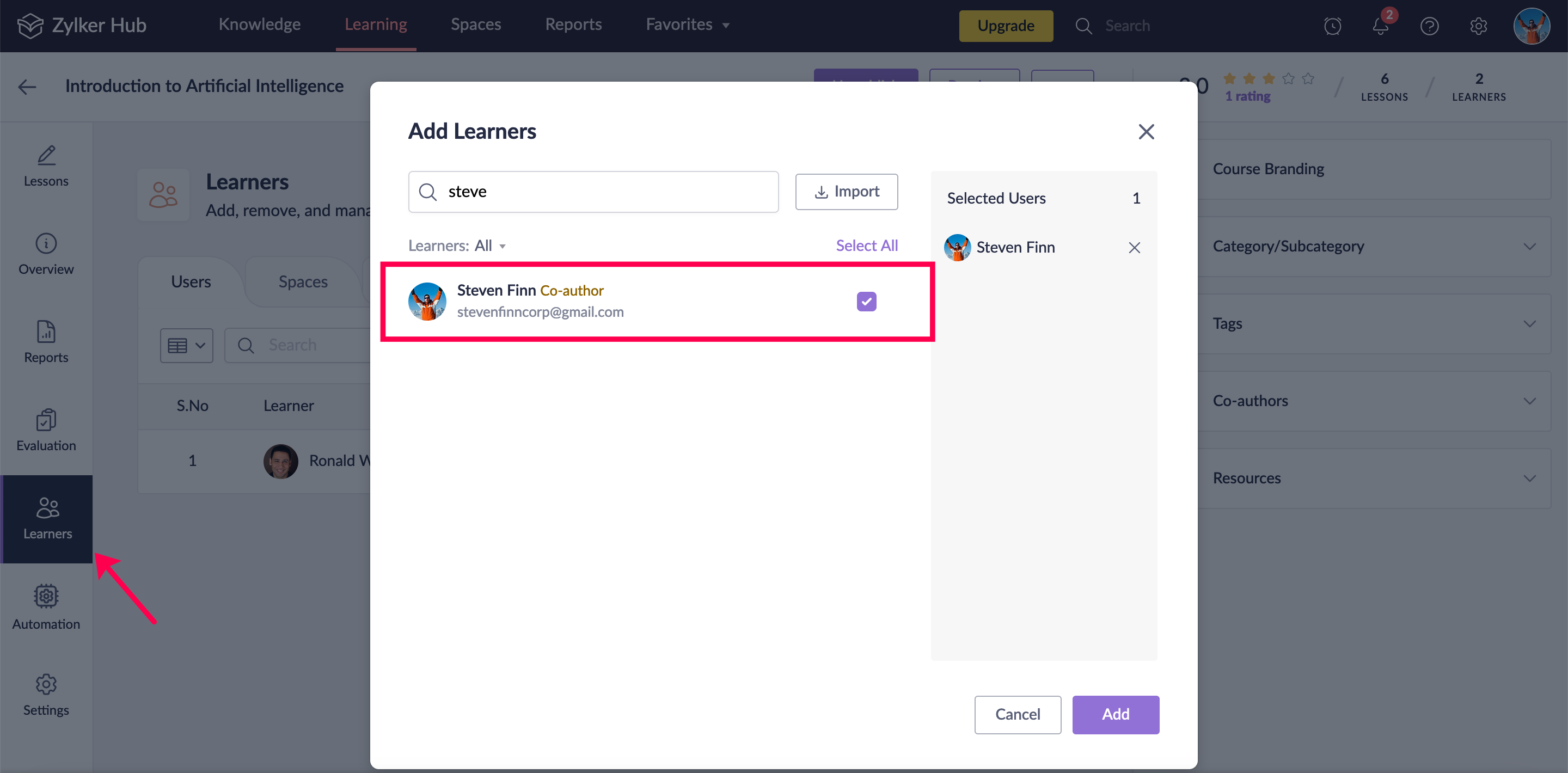 Course admins can add themselves to courses in Zoho Learn. This feature is particularly useful for mandatory and compliance-related courses where all team or company members are required to participate. Course authors and co-authors(contributors and instructors) can be added as learners in a course.