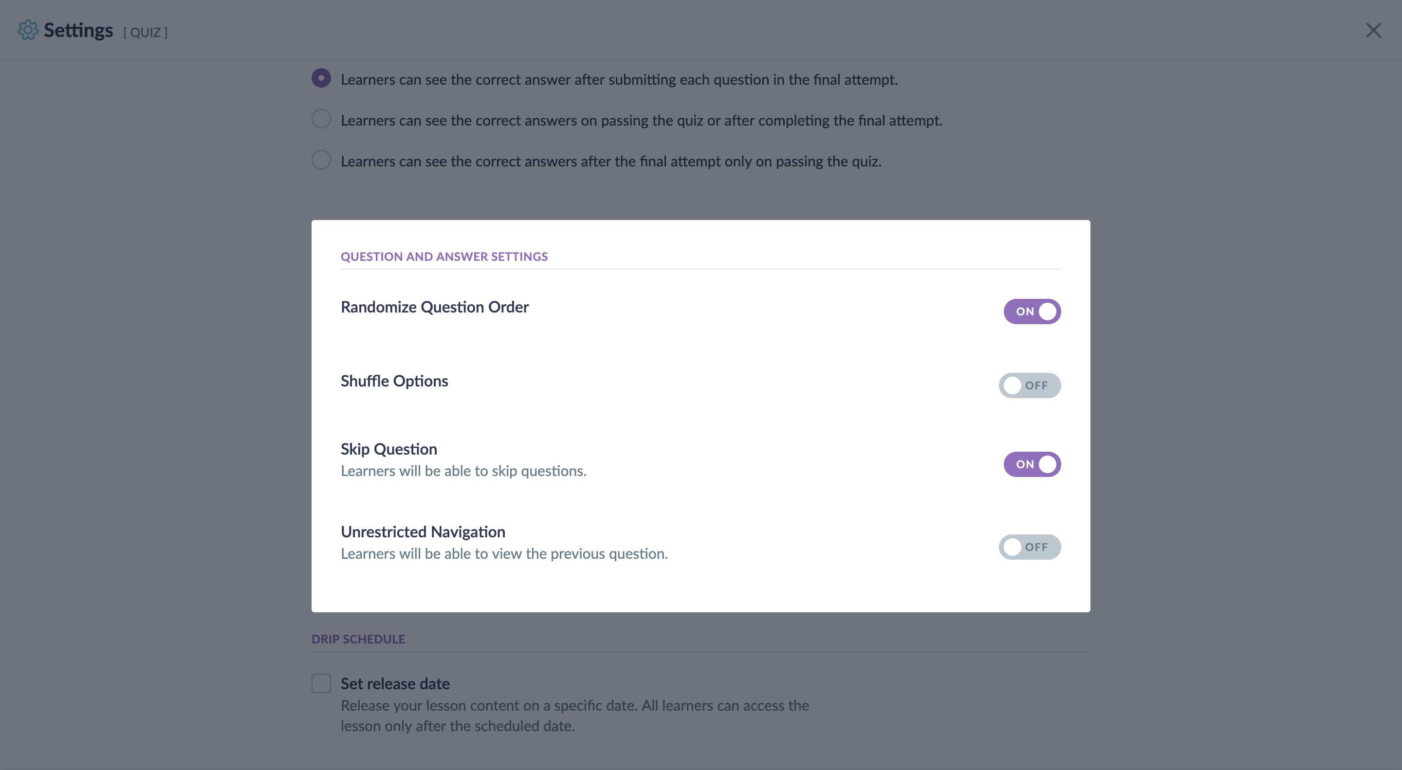 To set drip schedule for the quiz, check Set release date in the Drip Schedule section, then set the release date.