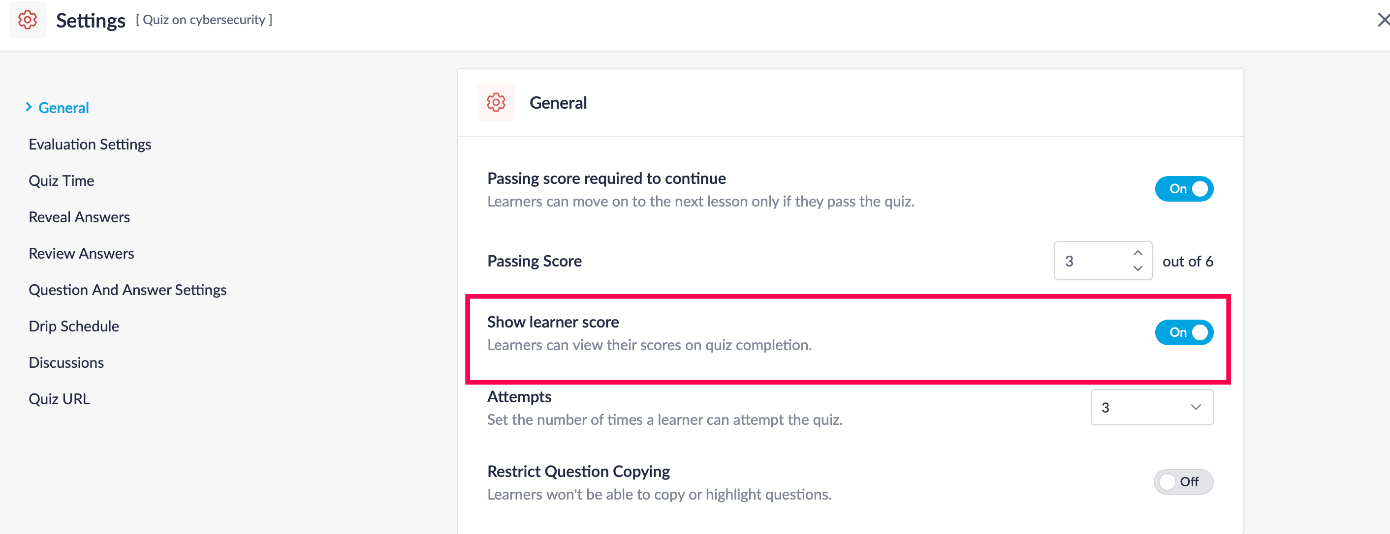 You can set a minimum score a learner has to obtain for them to pass a quiz, and control their progress in the course based on the passing score. You can also set the maximum number of times a learner can attempt a quiz.