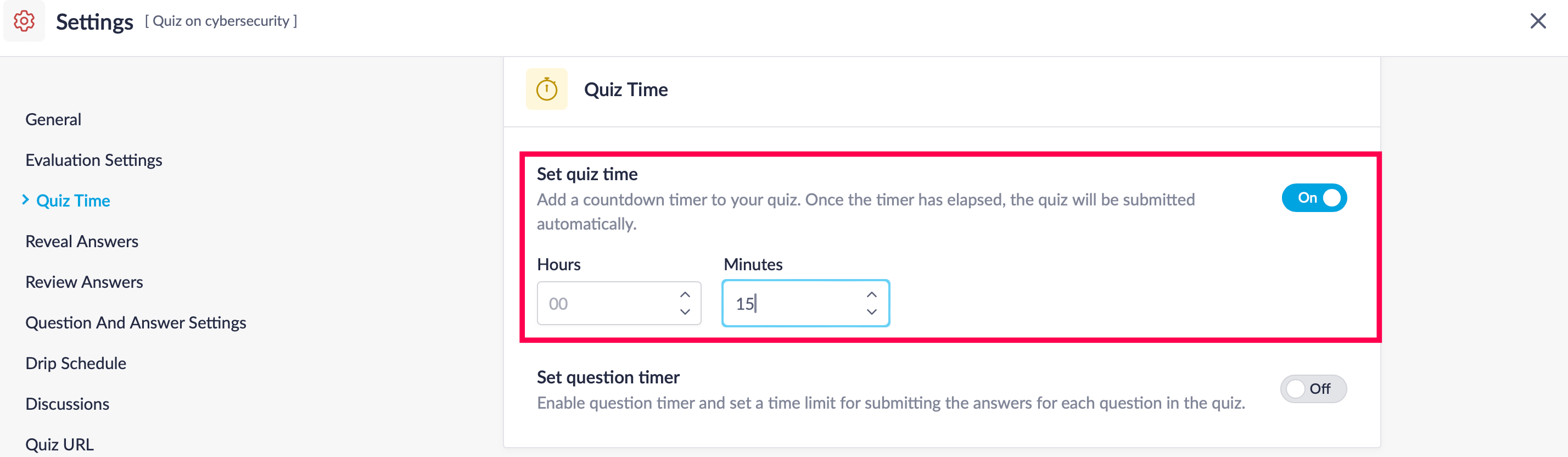 - Check the Set Quiz Time checkbox to add a countdown timer to the quiz.
