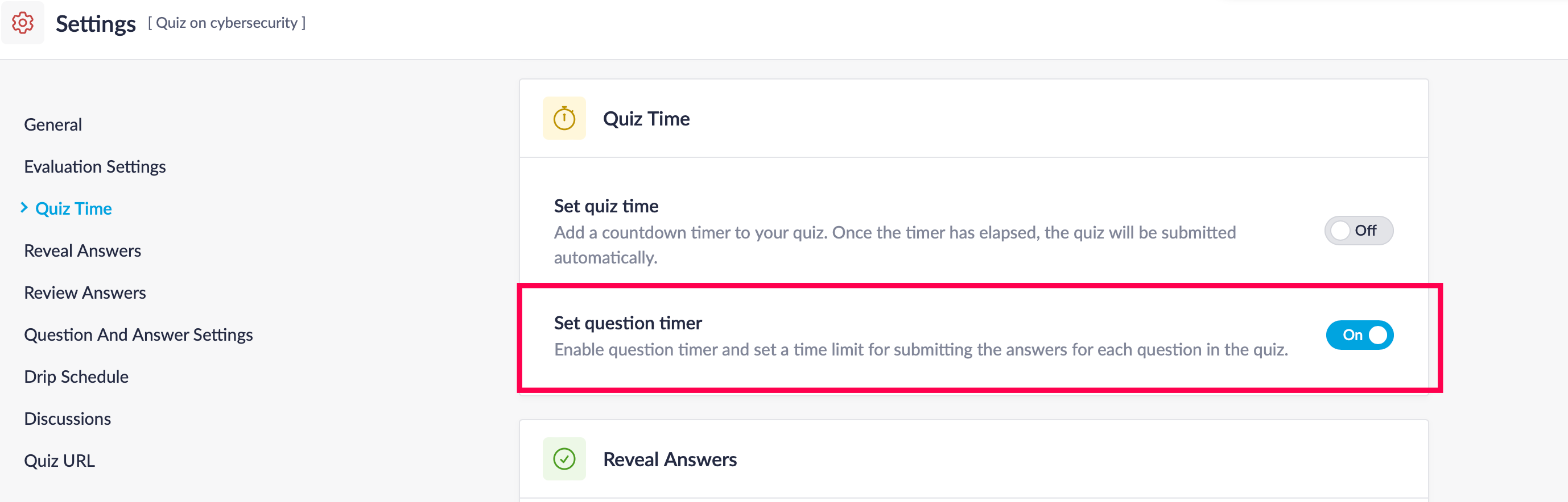 To enable question timer for a quiz, navigate to Quiz Settings, then switch the Set question timer button ON.