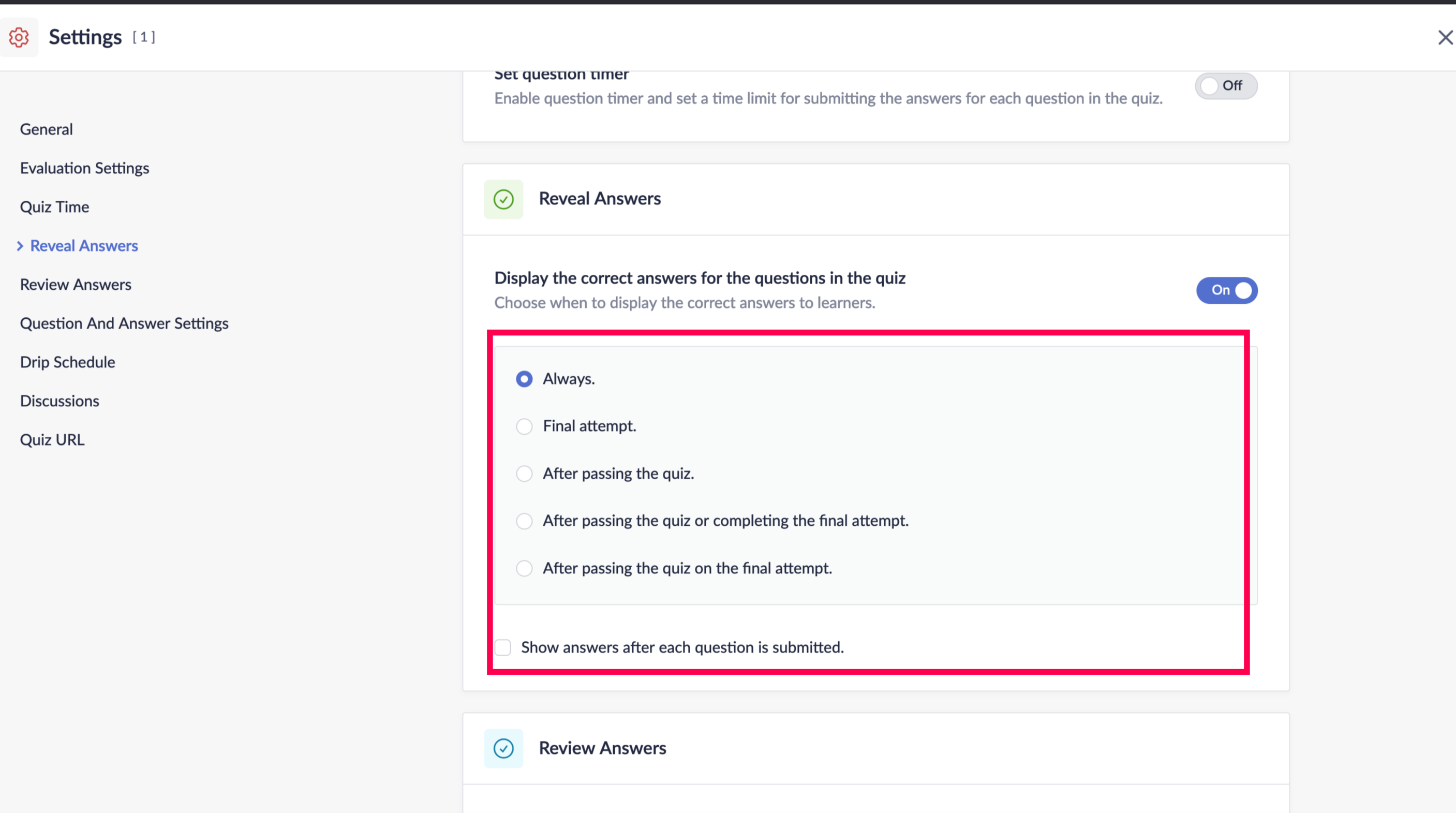 Enable reveal answers to reveal the correct answers for the questions to the learners. You can choose to reveal the answers on one of the following conditions.