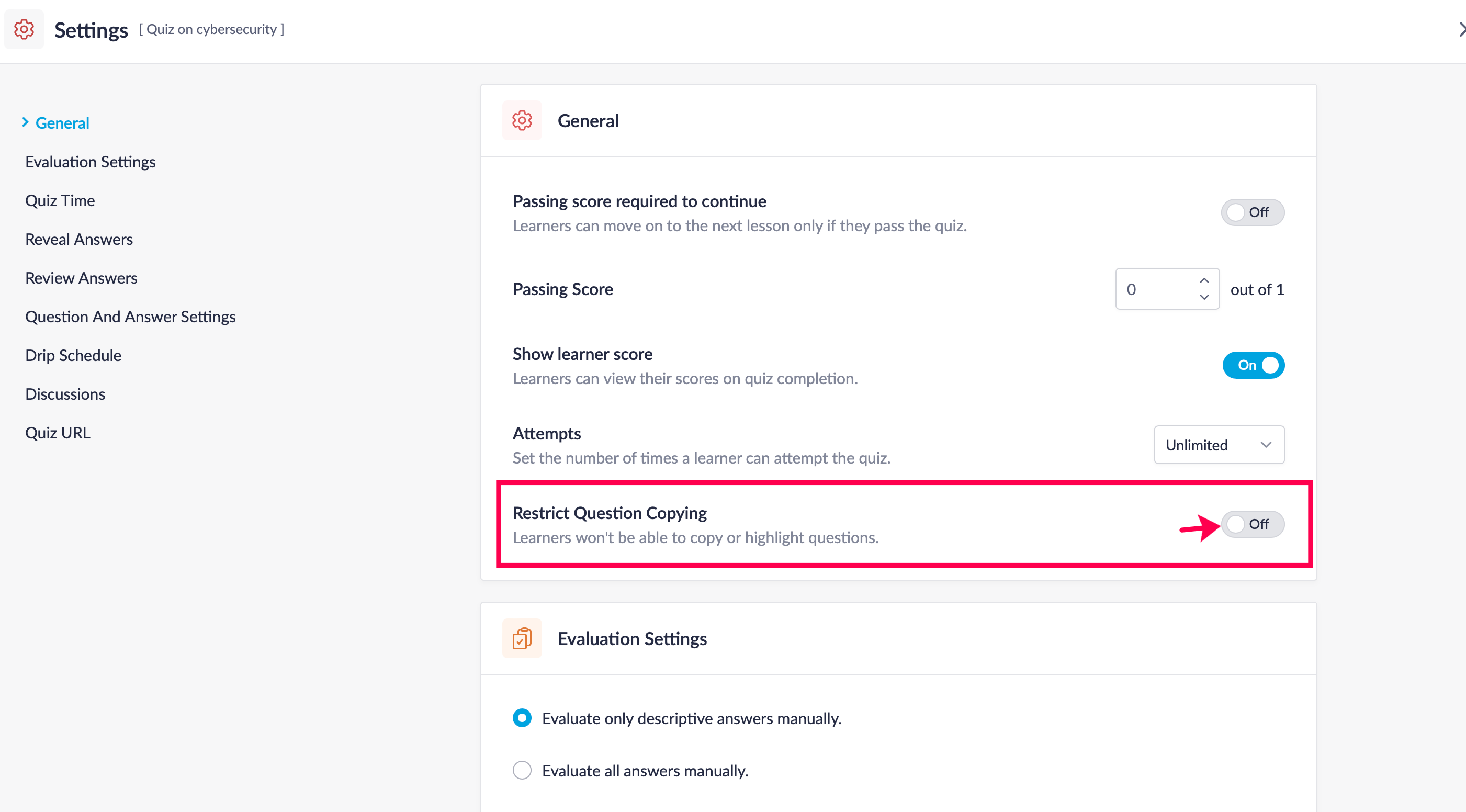 - Go to the Evaluation Settings section in Quiz Settings.