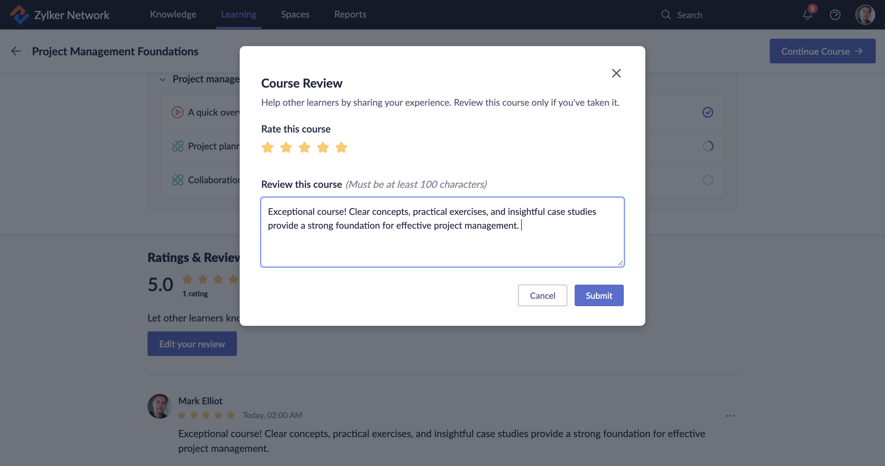 1. On the course completion page, give stars to rate your experience in the course. (or) Navigate to the course from the My Learning tab, then click the Write a Review button at the end of the course home page.