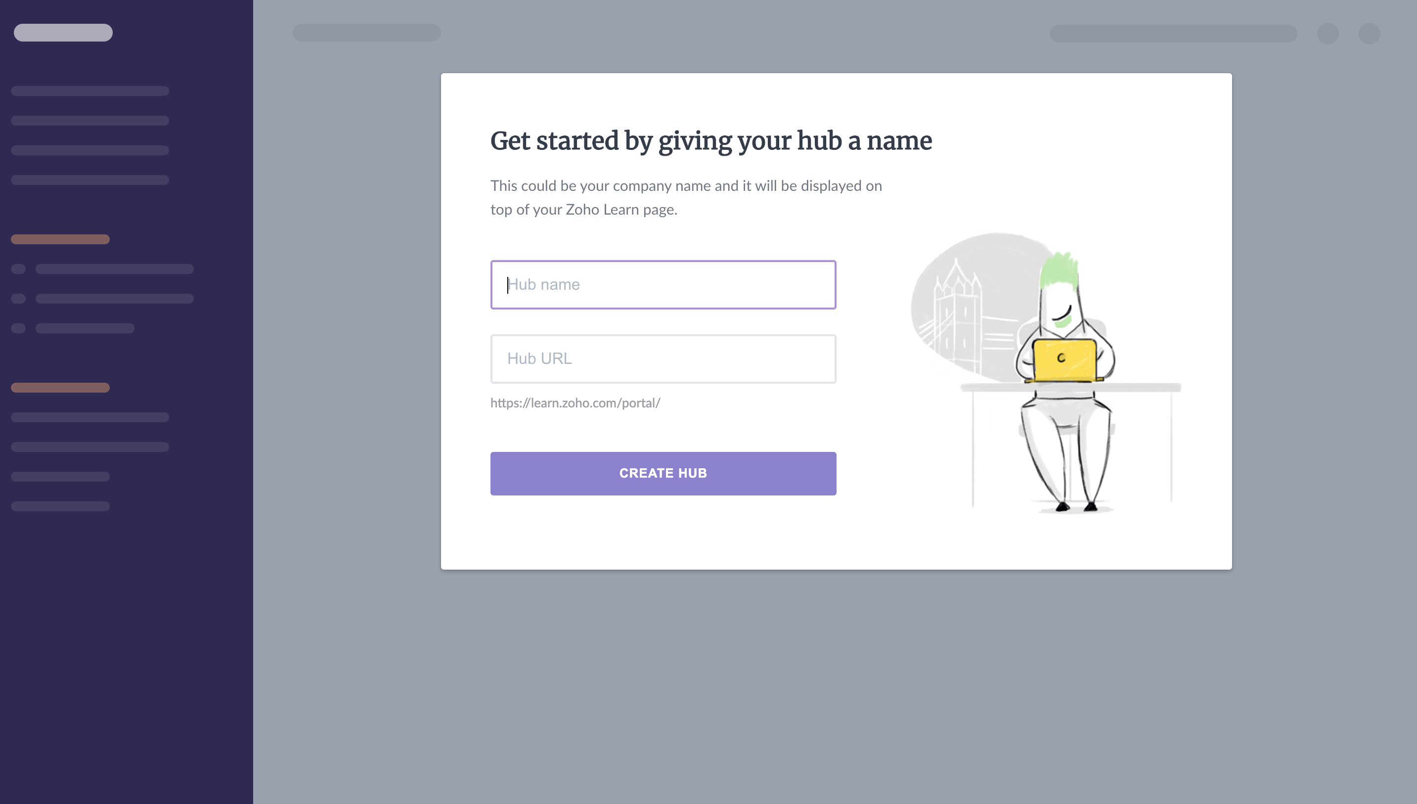 1. Log in to Zoho Learn, enter a name for the hub and the URL.