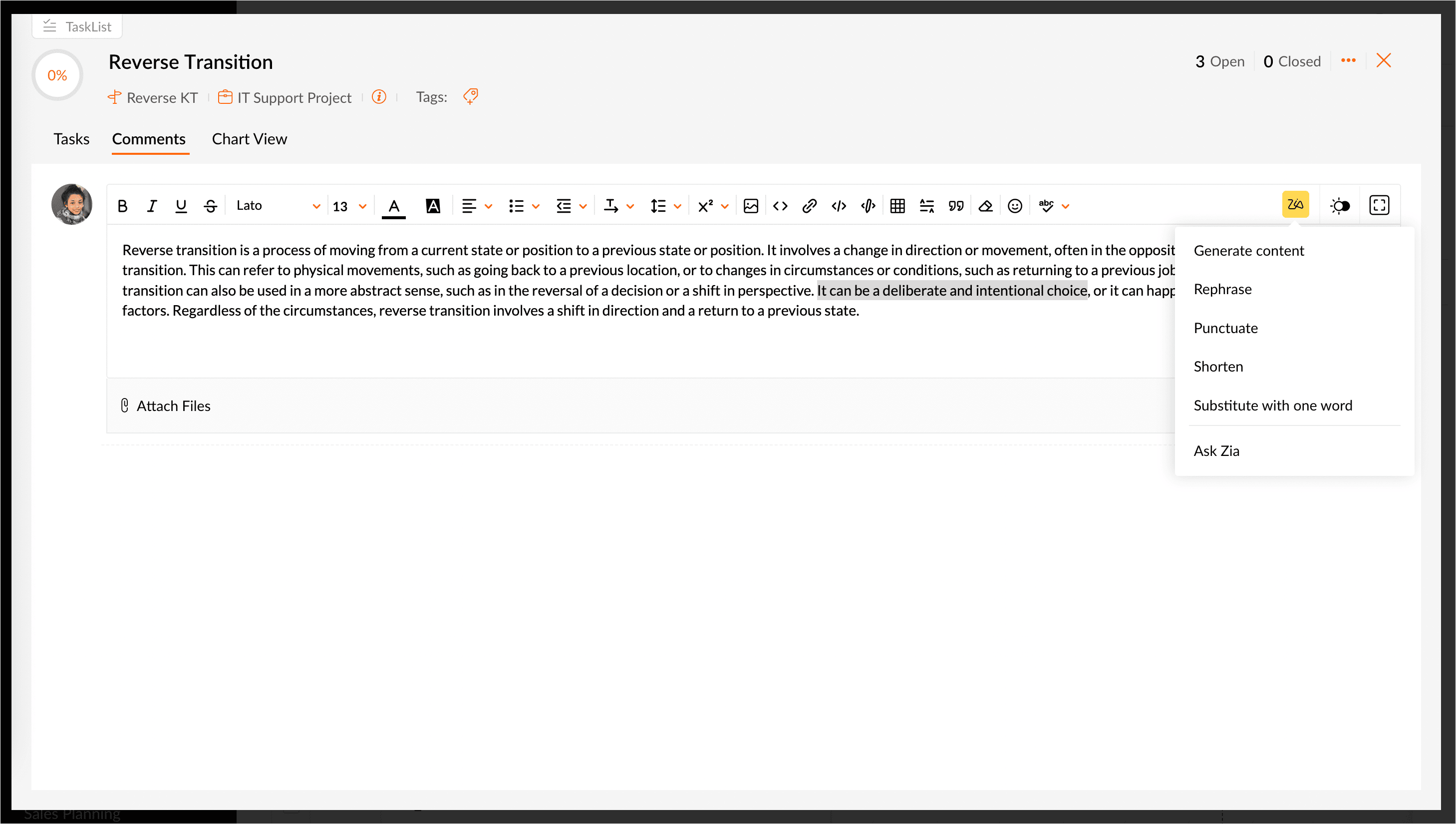 Zia, powered by ChatGPT, enables your team members to create new content or fine-tune existing content based on keywords. Users can select an entire block of text or a portion of the text from the description or comment and ask Zia for suggestions. Be it creating project scopes or redefining existing descriptions, generative AI does it all with ease.