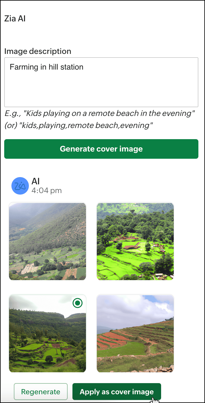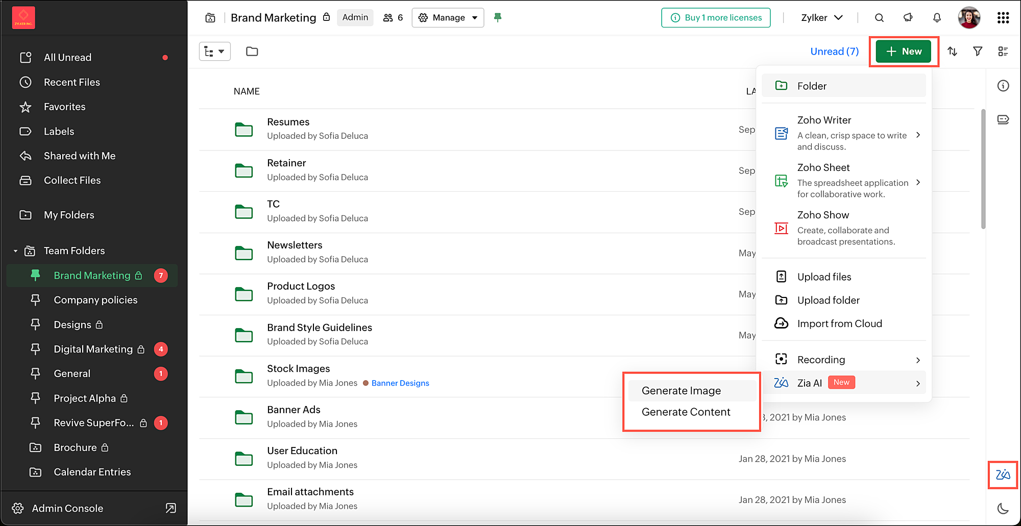 Zia AI helps you generate content and images instantly within the WorkDrive platform. Whether you're working on a blog post, article, worksheet, or presentation, Zia can assist you with content and image generation and enhance the quality of your content easily.