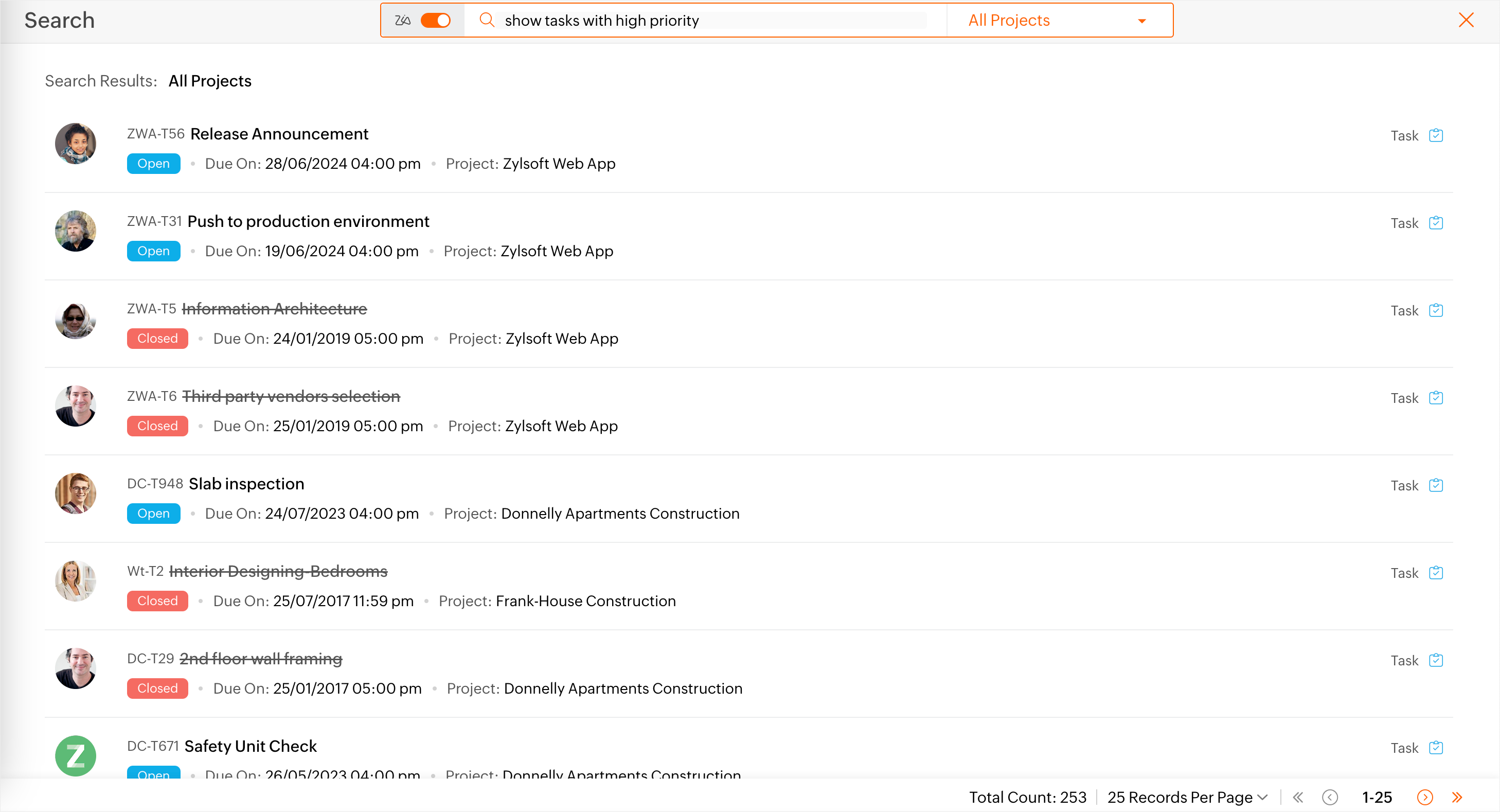 Zia Search eliminates the need for complex syntax, employing NLP to find the right data using natural language. Once it is enabled, users can ask questions in conversational language with different project information and get desired results.