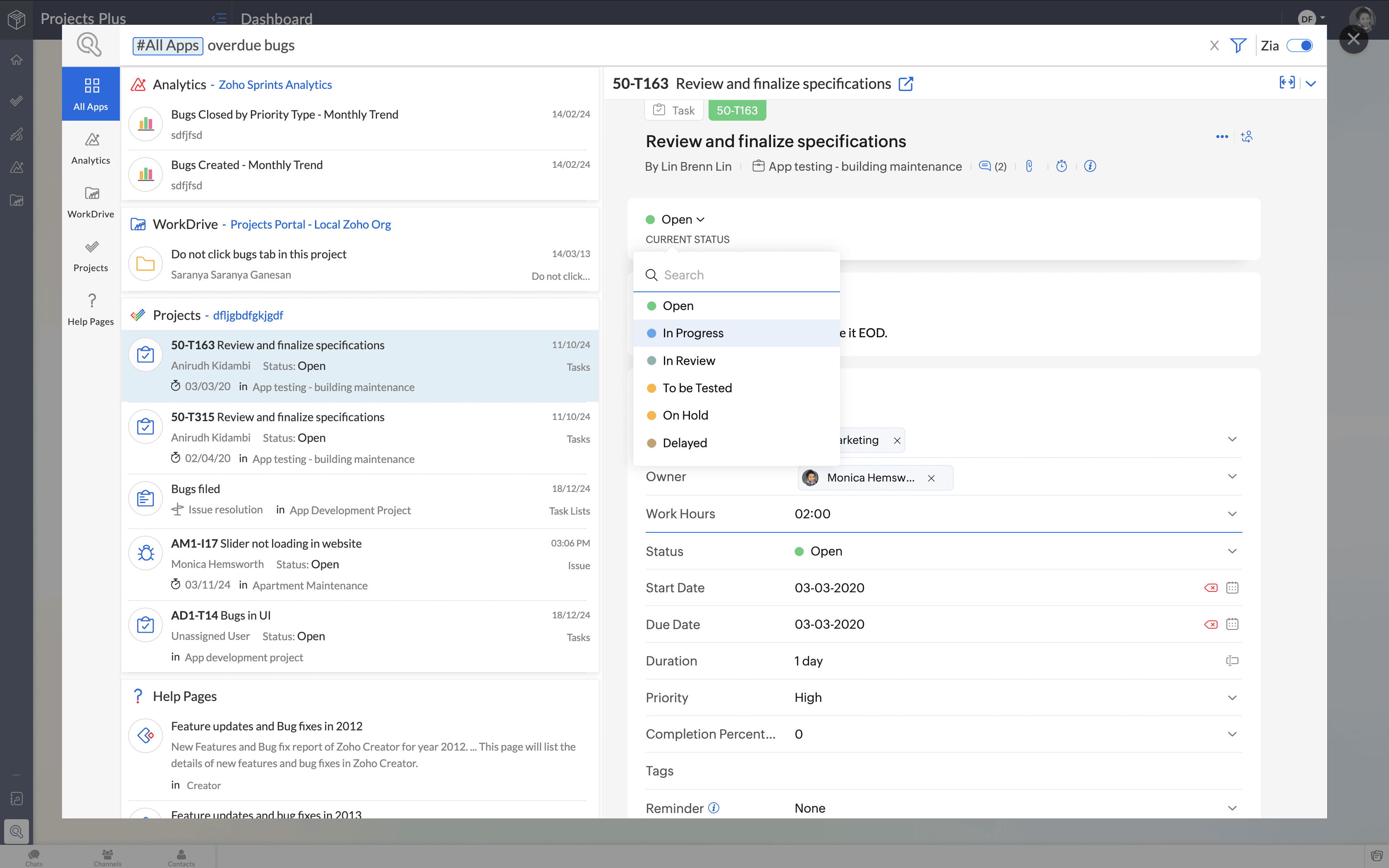 Understanding this challenge, Zia search in Zoho Projects Plus offers a unified search across all applications—Projects, WorkDrive, and Analytics. You can expect Sprints very soon.