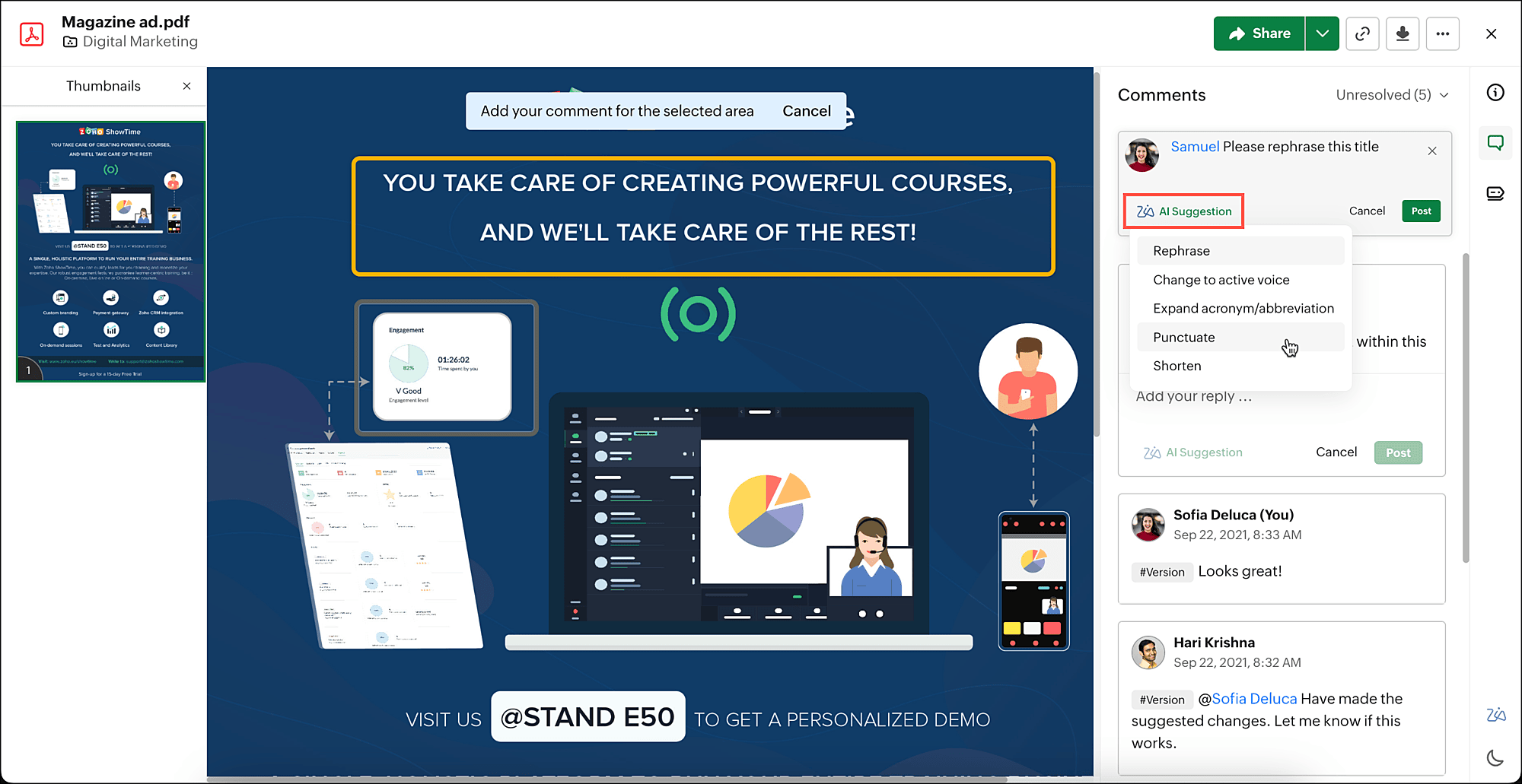 Comments help team members collaborate on their documents, sheets, and presentations. Zia AI’s real-time commenting suggestions help users write relevant comments with proper grammar and stay in context. Zia AI can help rephrase, shorten, and punctuate your comments, ensuring clarity in your messages.
