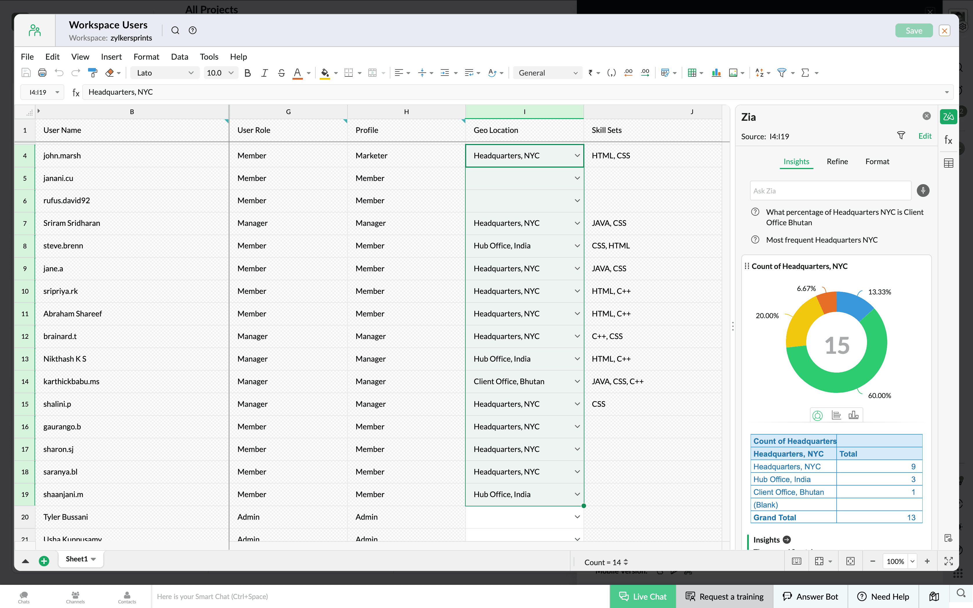 Zia is readily available in the Sheet View of Workspace Users in Zoho Sprints to provide Zia Insights. You can select a specific column in the sheet and derive insights on it using Zia.