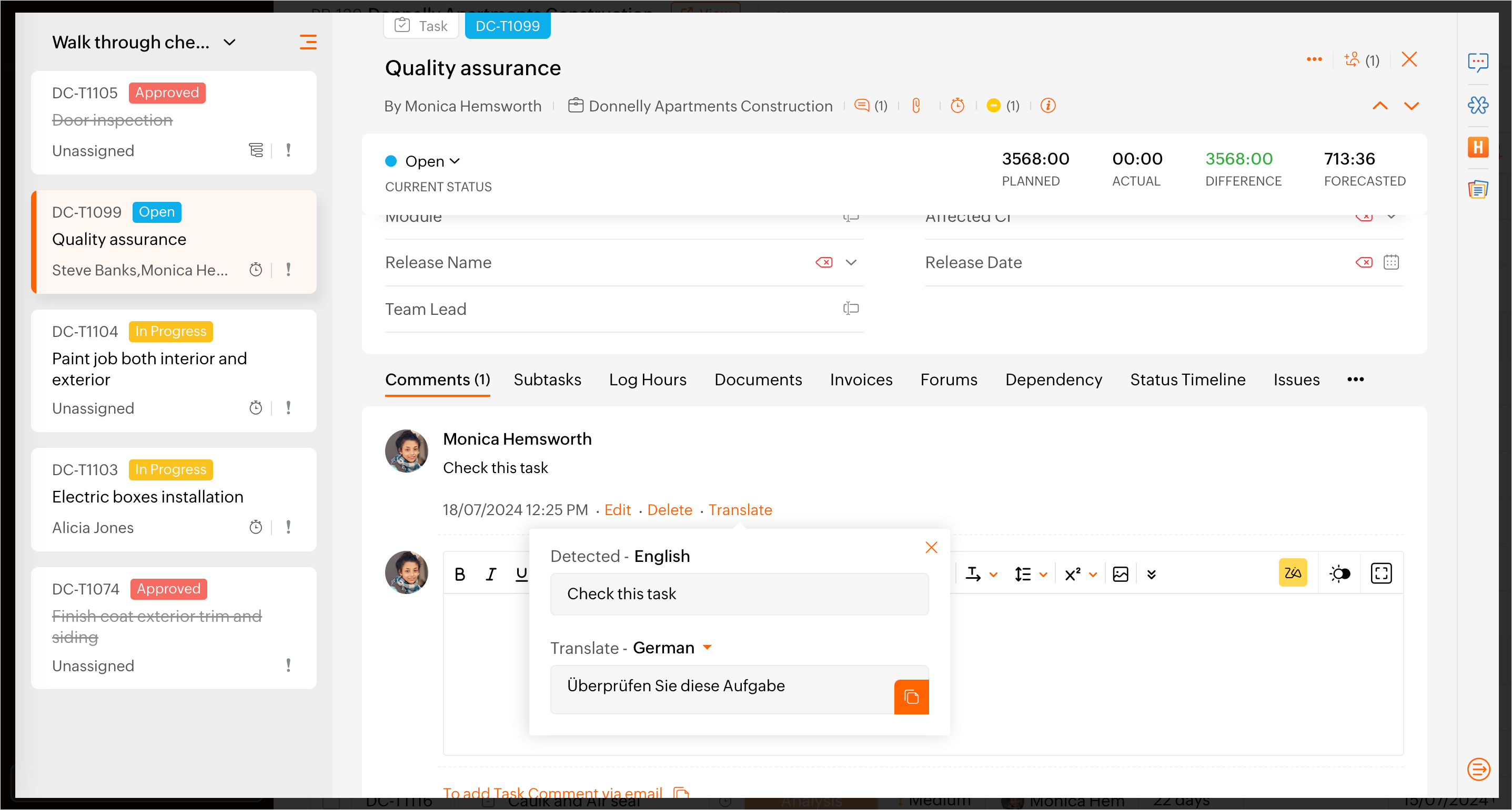 With transnational teams serving a global audience, language is never a barrier while managing your teams with Projects. Zia Translate can seamlessly translate user input into over 70 languages to help users stay in context. It helps improve accessibility, understanding, and promotes inclusivity within the organization.