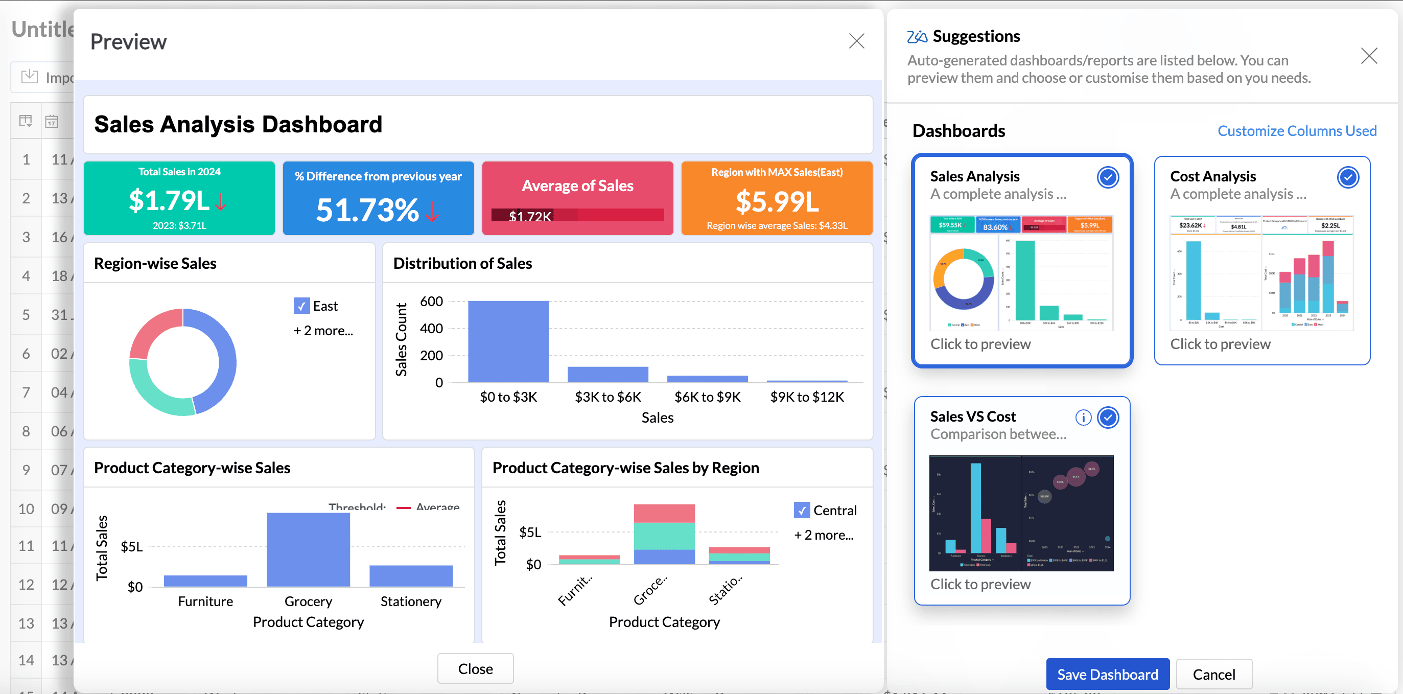 Auto Analysis helps you process large amounts of raw and unprocessed data into valuable insights and identify trends. Analytics uses generative AI, machine learning, and natural language processing techniques to understand the meta information and schema of the data and generate reports and dashboards using it.