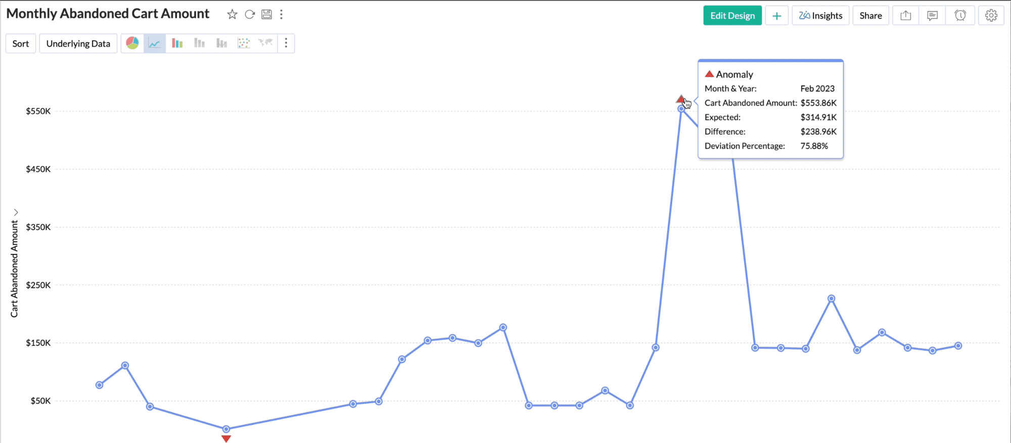 Anomaly, or outlier detection, is the process of identifying events or data points that exhibit a significant deviation from the standard or expected pattern. Zoho Analytics deploys robust machine learning algorithms like RPCA (Robust Principal Component Analysis) and various statistical models to detect the outliers. Identifying the outliers help pre-detect bottlenecks and arrive at alternate strategies for a streamlined project performance.