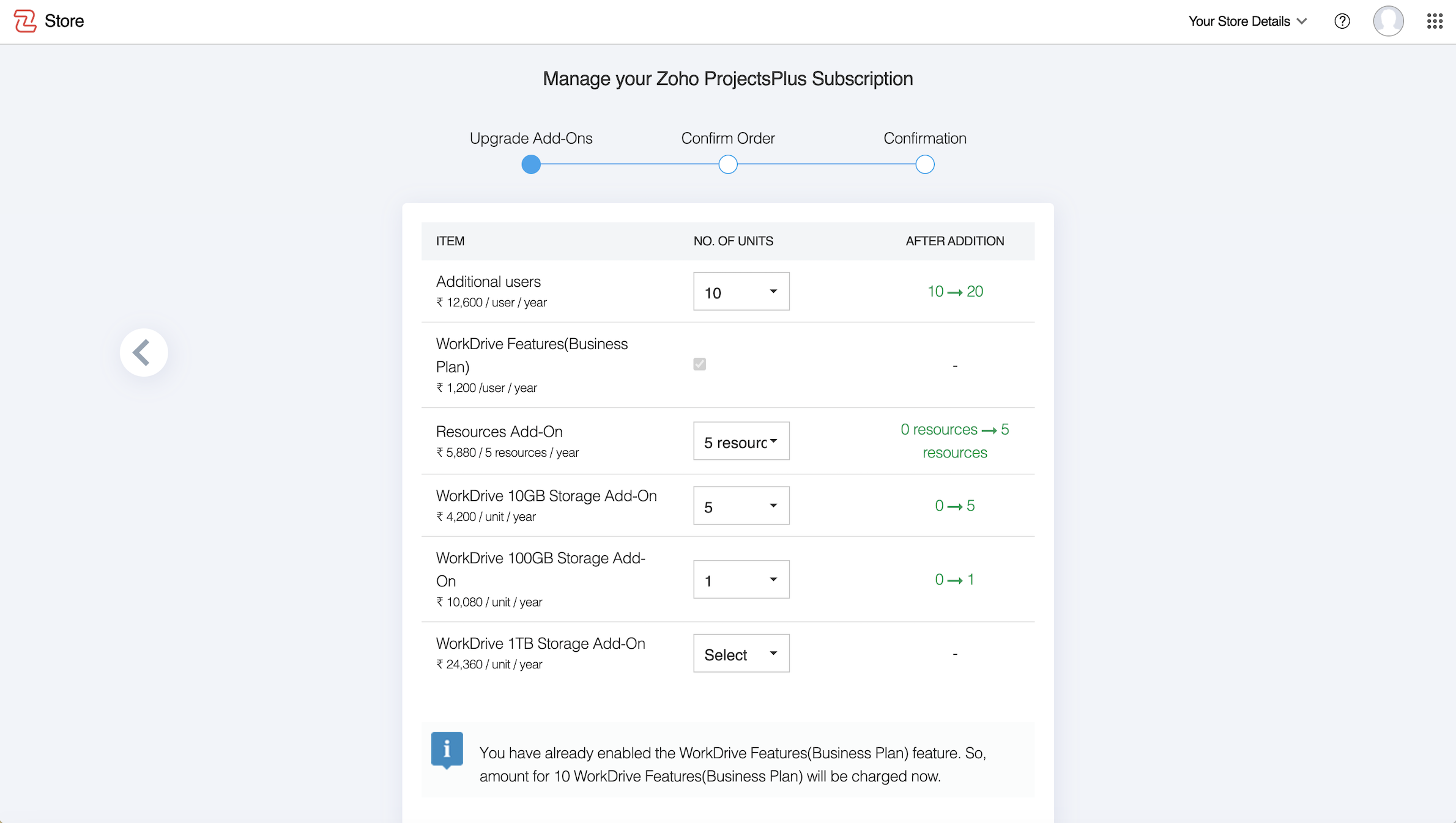 - Click Upgrade User/Add-Ons to purchase additional users, resources, WorkDrive or Analytics features, or WorkDrive storage.