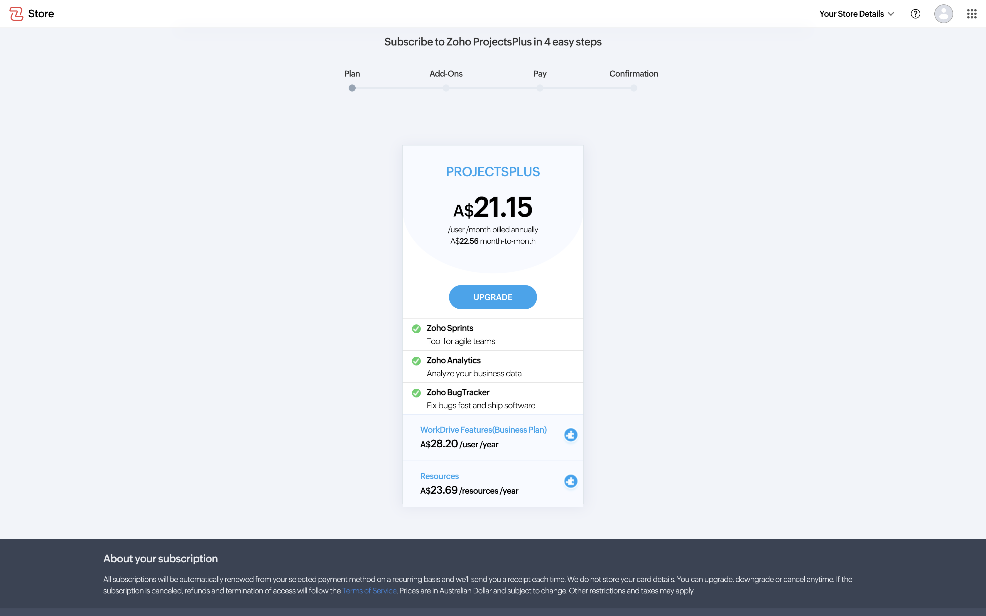 - Click Manage under the Subscription section. You will be redirected to Zoho Store.