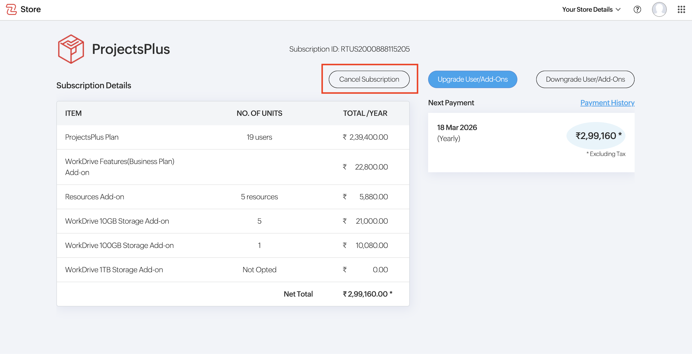 - Under Subscription, click Manage. You will be redirected to Zoho Store to view the subscription details.