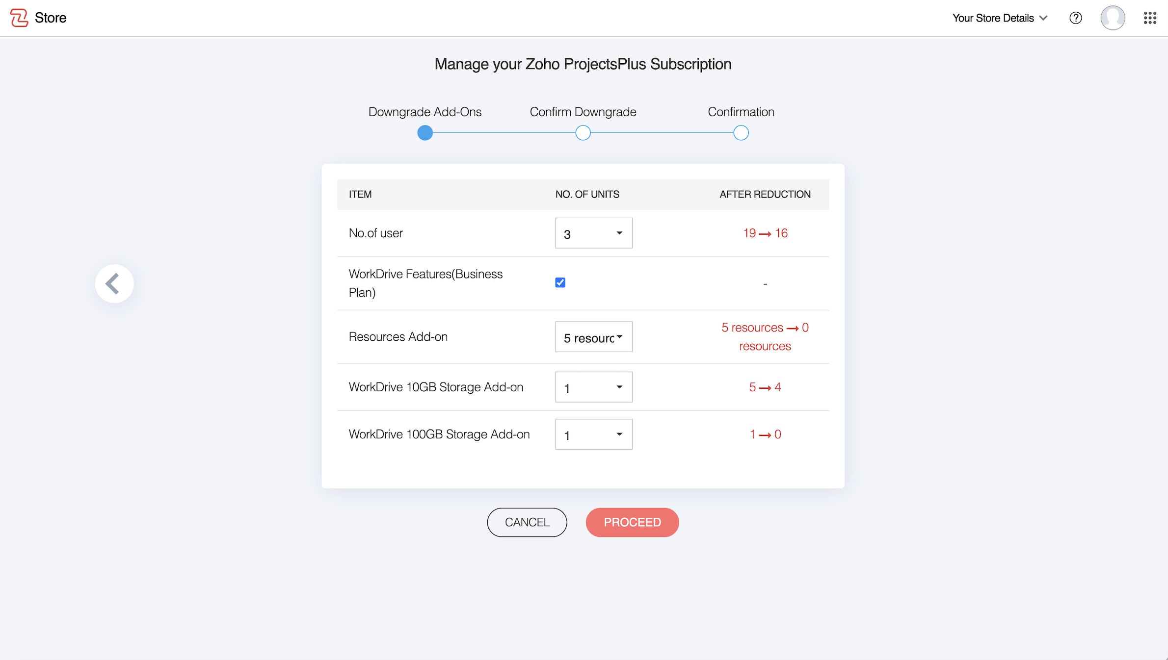 When you wish to reduce the number of users and resource add-ons, or remove WorkDrive or Analytics add-ons, or remove WorkDrive storage add-ons, you can choose to downgrade user/add-ons.