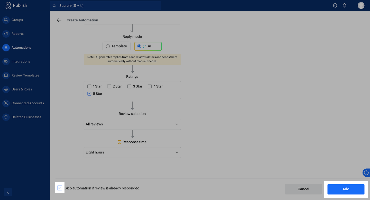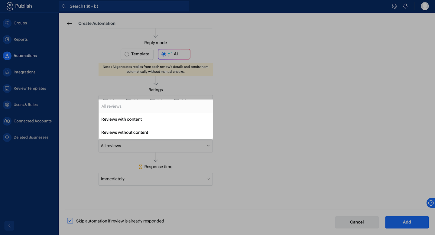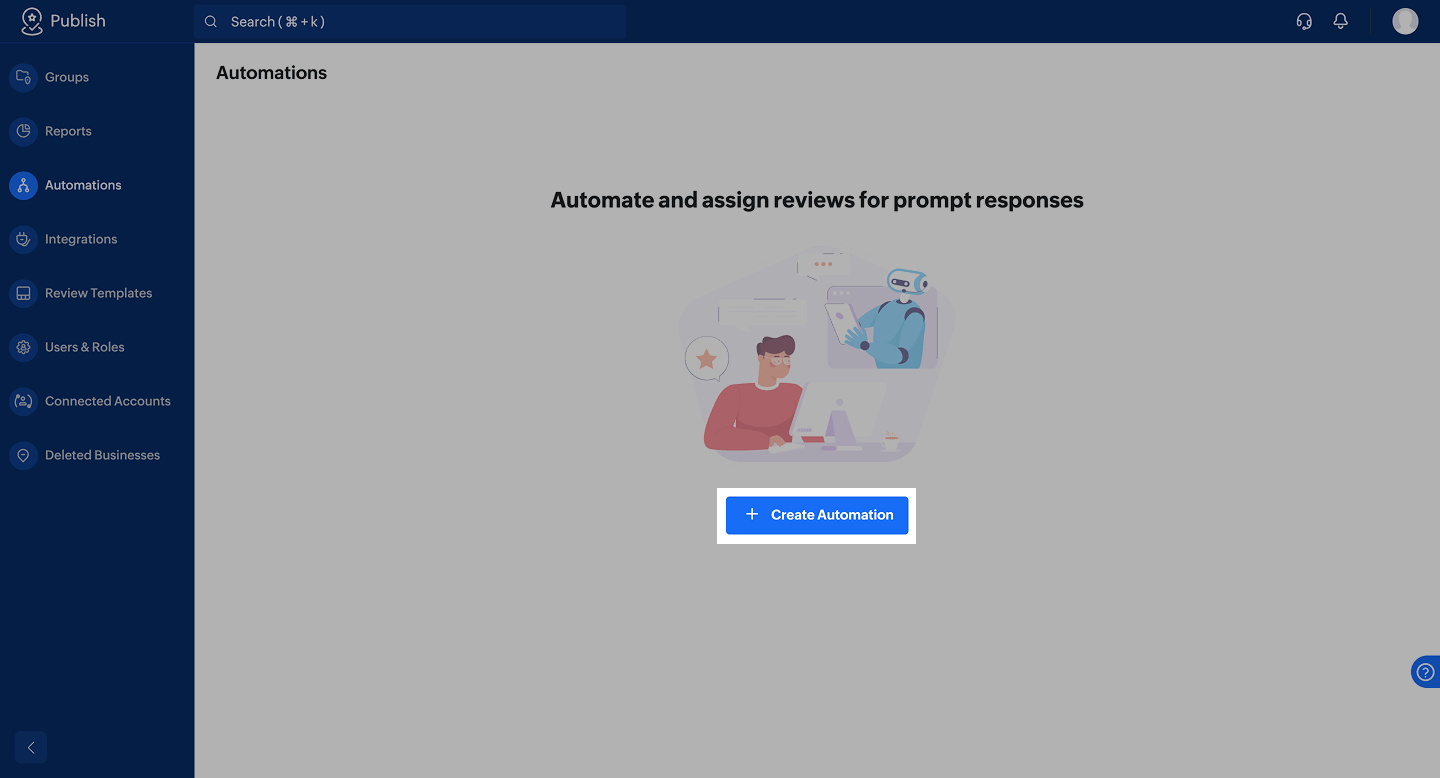 Automating review responses can significantly improve your response rate, save time, and reduce costs compared to managing a separate customer retention team. It's ideal for handling a large volume of 4 or 5-star reviews. Click Automations in the ...