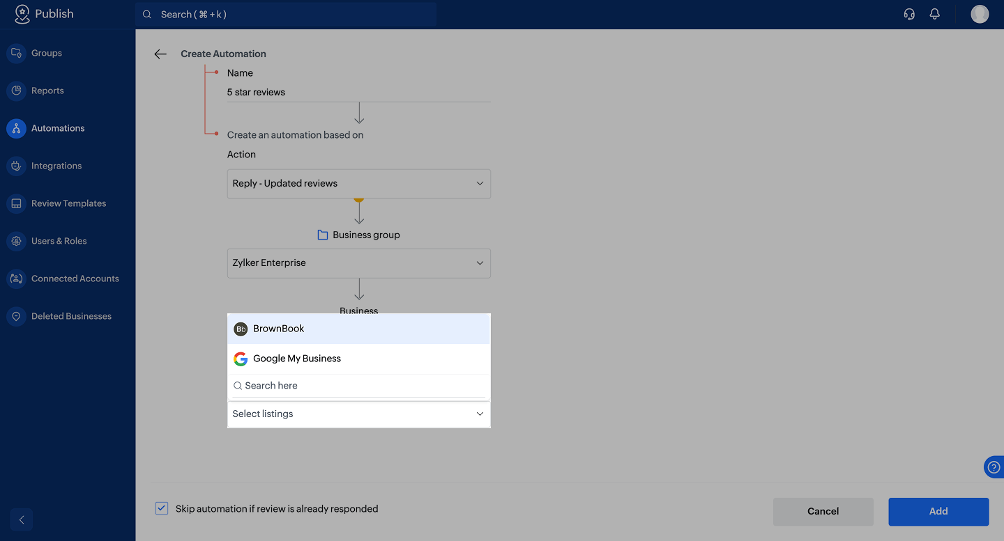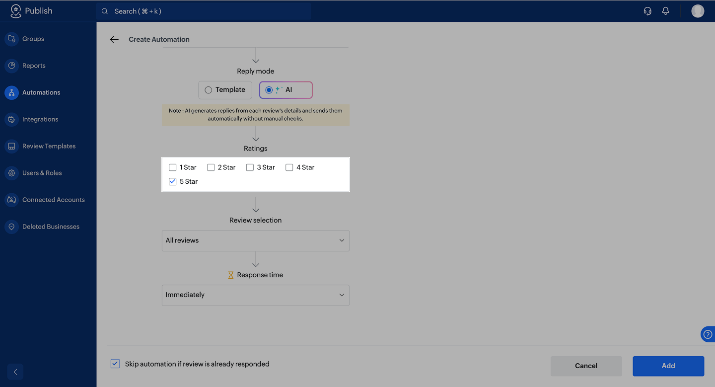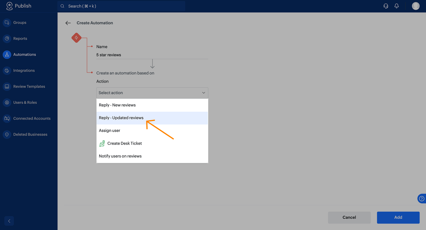 Automating review responses can significantly improve your response rate, save time, and reduce costs compared to managing a separate customer retention team. It's ideal for handling a large volume of 4 or 5-star reviews. Click Automations in the ...