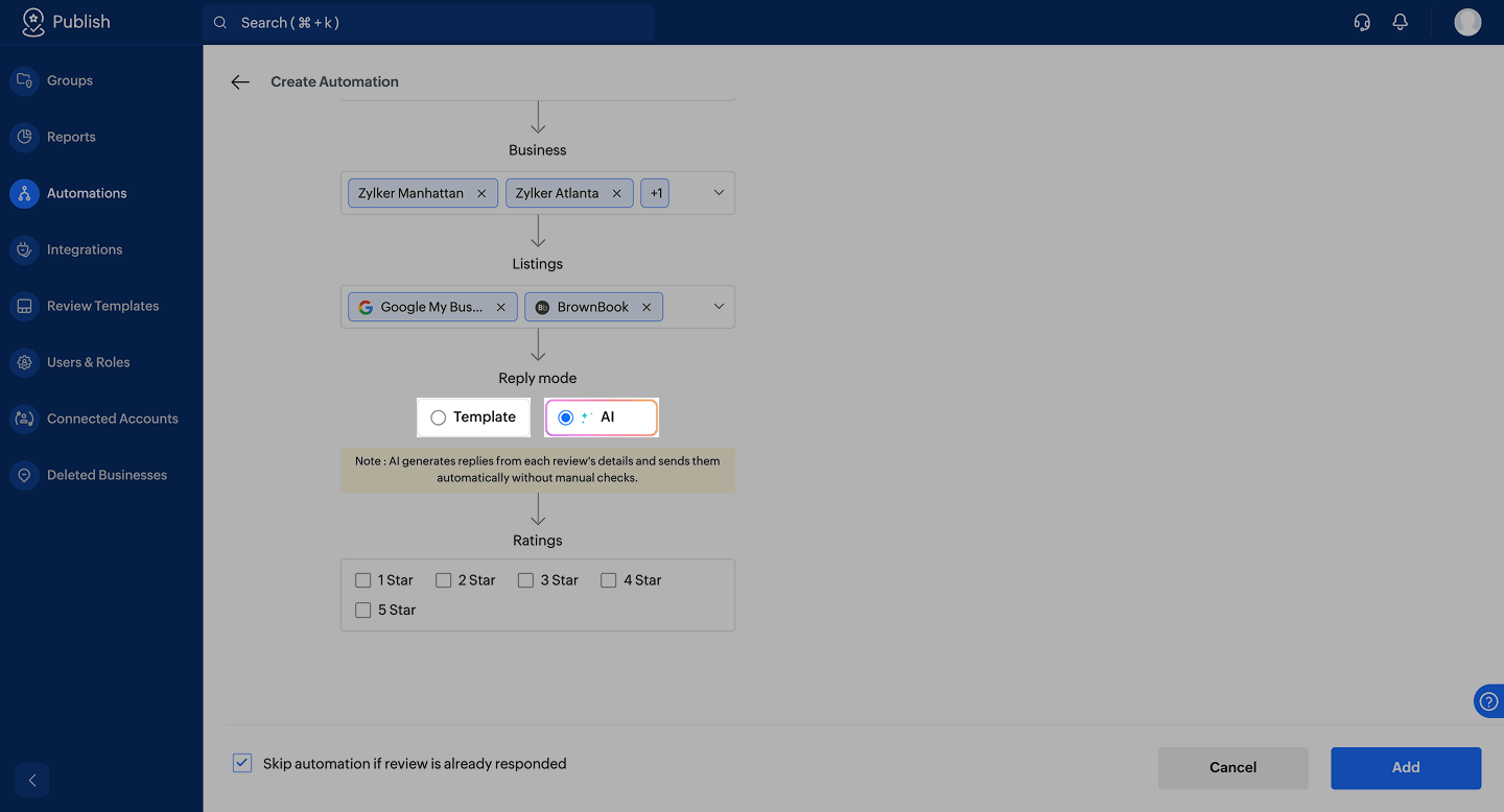 1. When multiple automations share the same Business Groups, Businesses, Ratings, and Listing sites, the most recently modified or created one will be active.