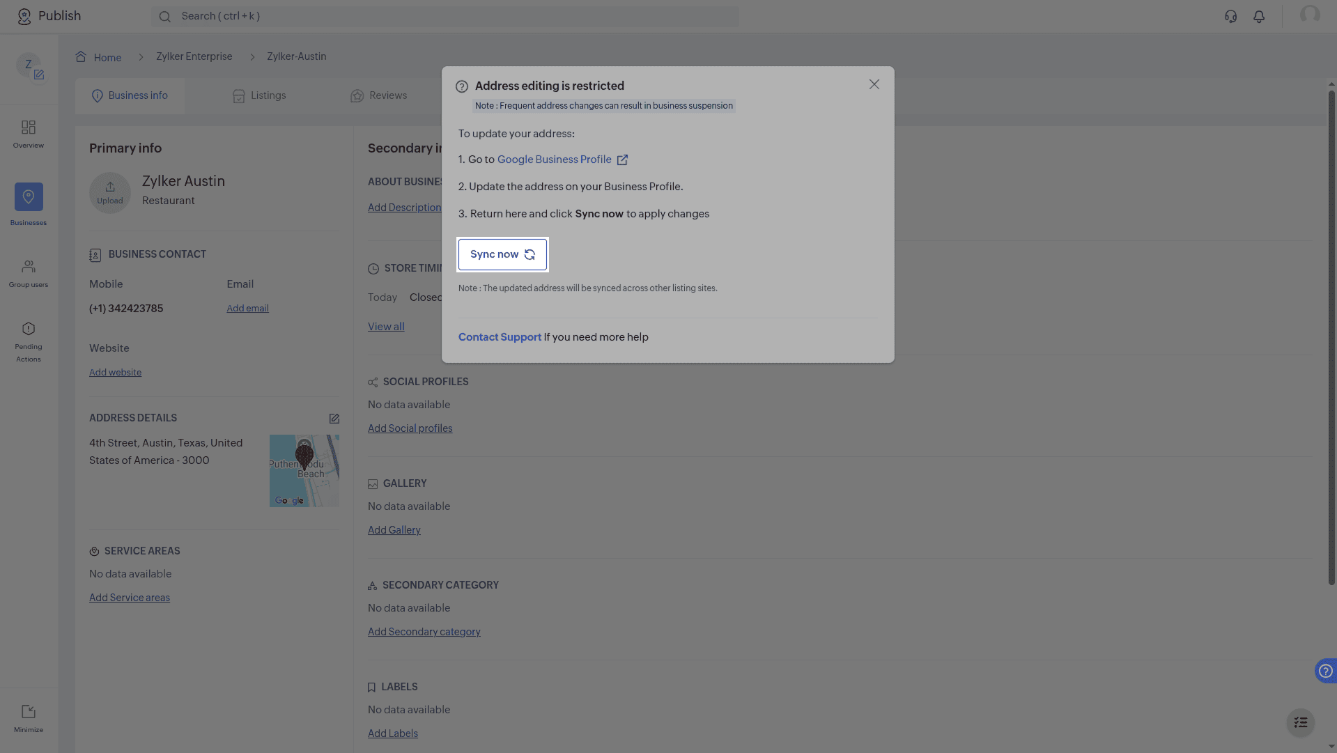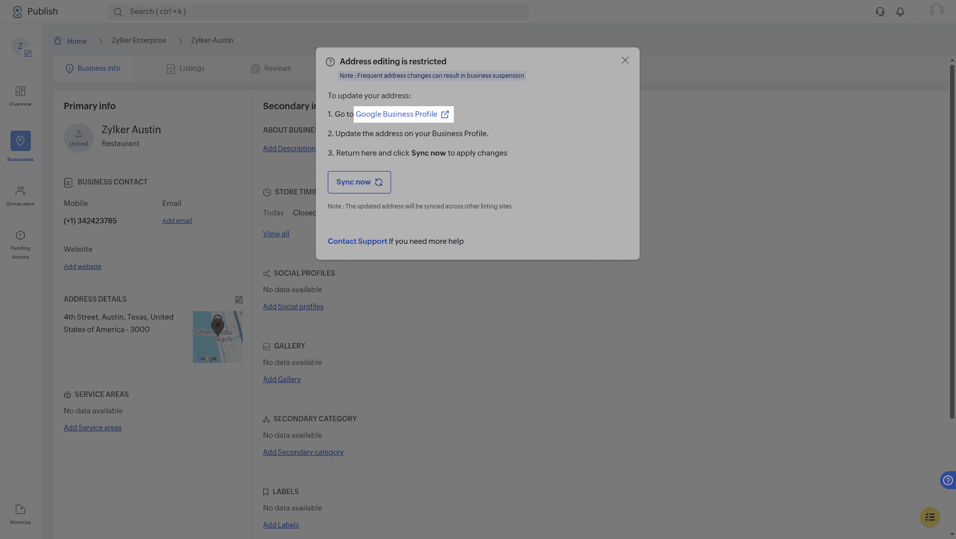 The location coordinates on Google Business Profile and Zoho Publish may sometimes differ. Click Resolve. Click Open Google Business Profile portal at the end of the pop up. Edit the location on Google Business Profile Manager. Go back to Publish. ...