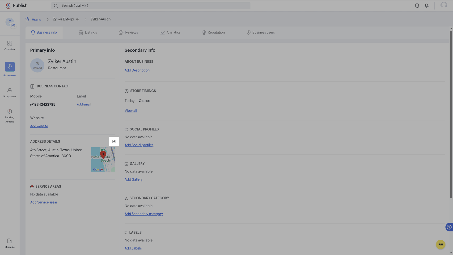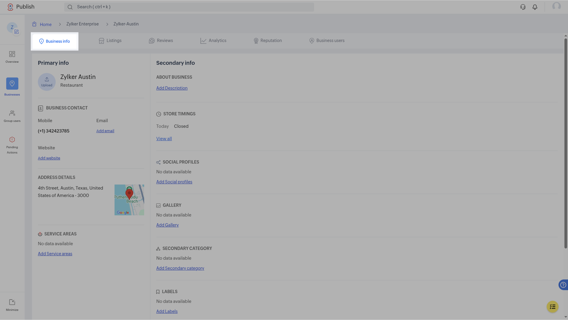 Business Info is where all your business details will be stored and managed. When you make a single update on this page, like extending store timing, it will be reflected across all connected listing sites, ensuring uniformity in your online ...