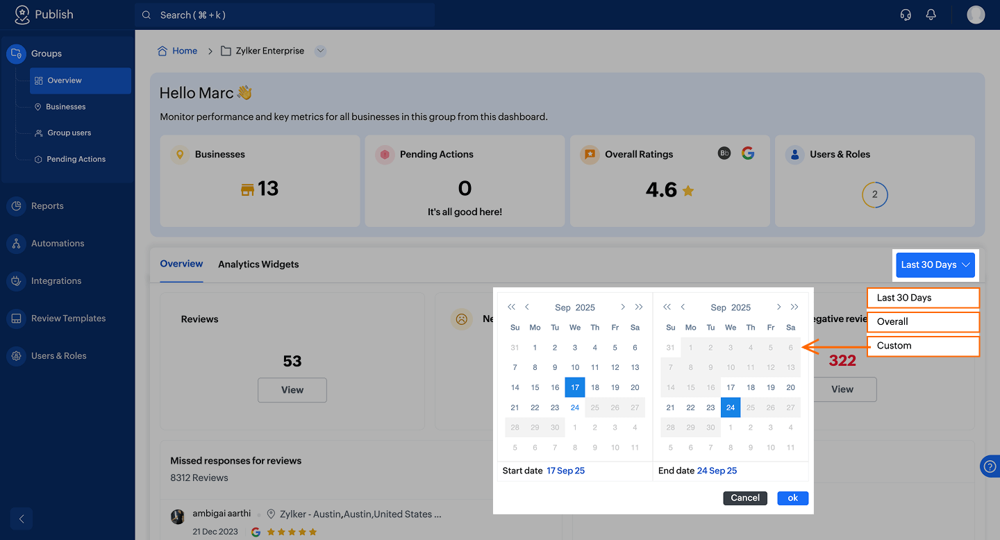 New reviews display the number of recent reviews received. You can apply the filter to view them within the timeframes of 7 days, 15 days, and 30 days. A pop-up appears, allowing you to respond to reviews manually or use review templates.