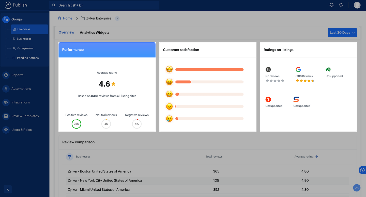Ratings on Listings segregate all connected business directories with their respective ratings. This comparison is valuable as it provides an overview of how your business is performing on different platforms.