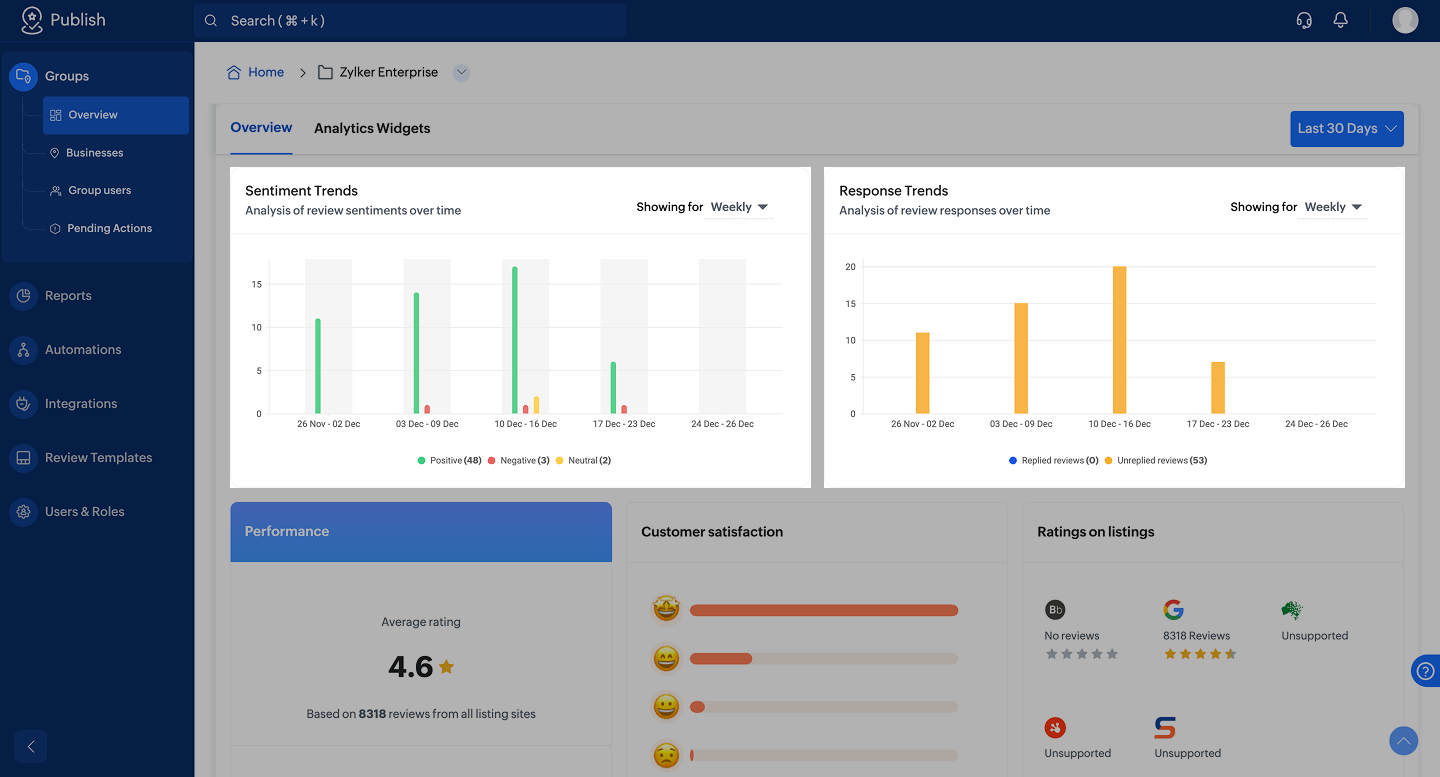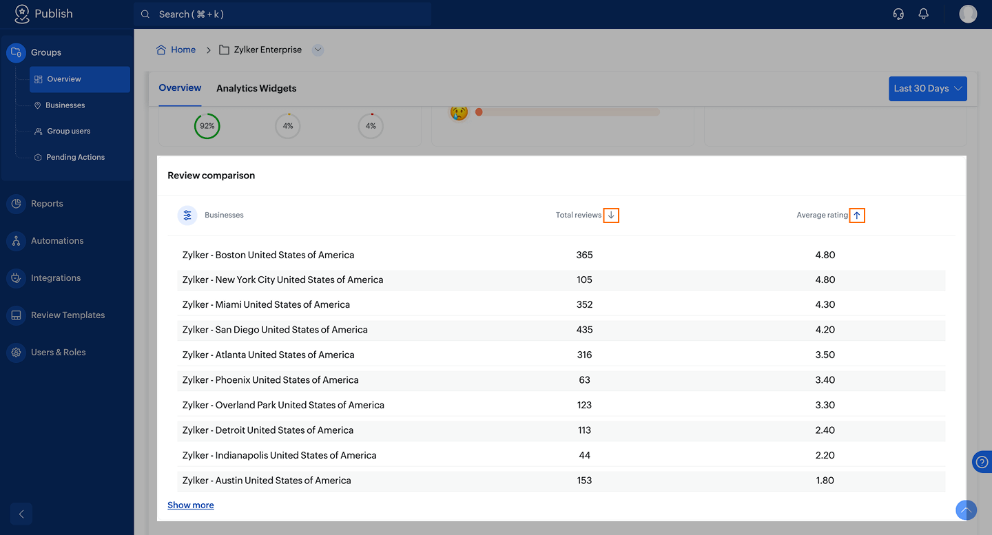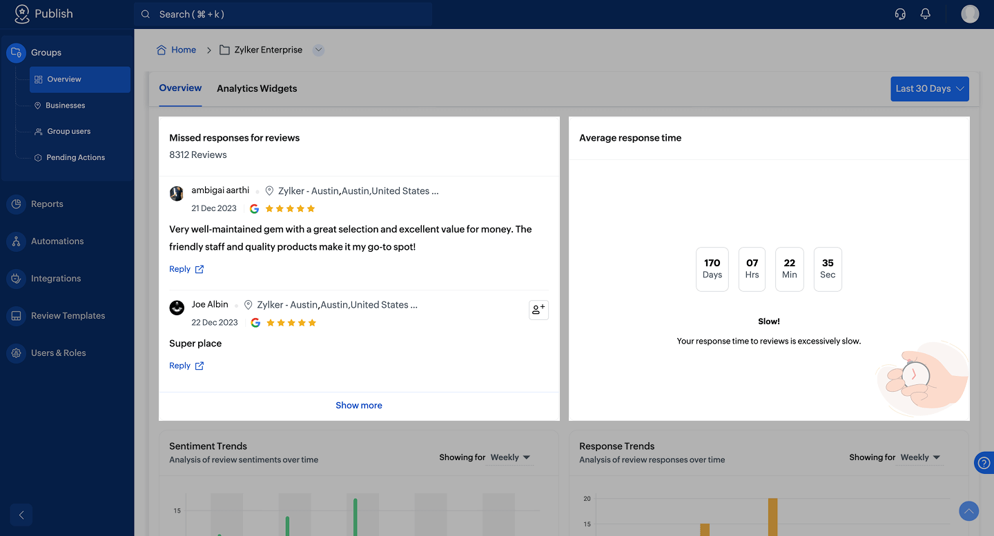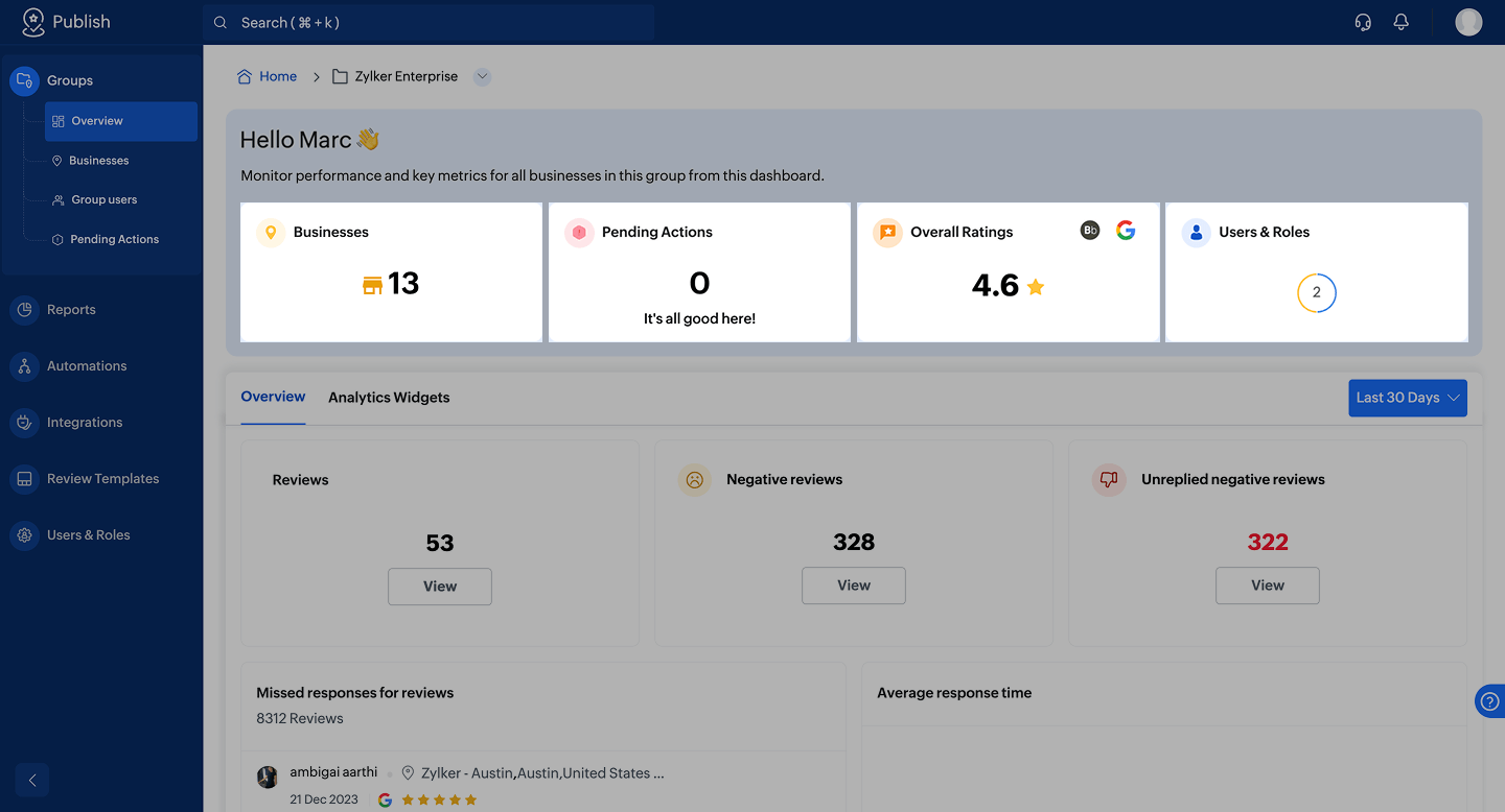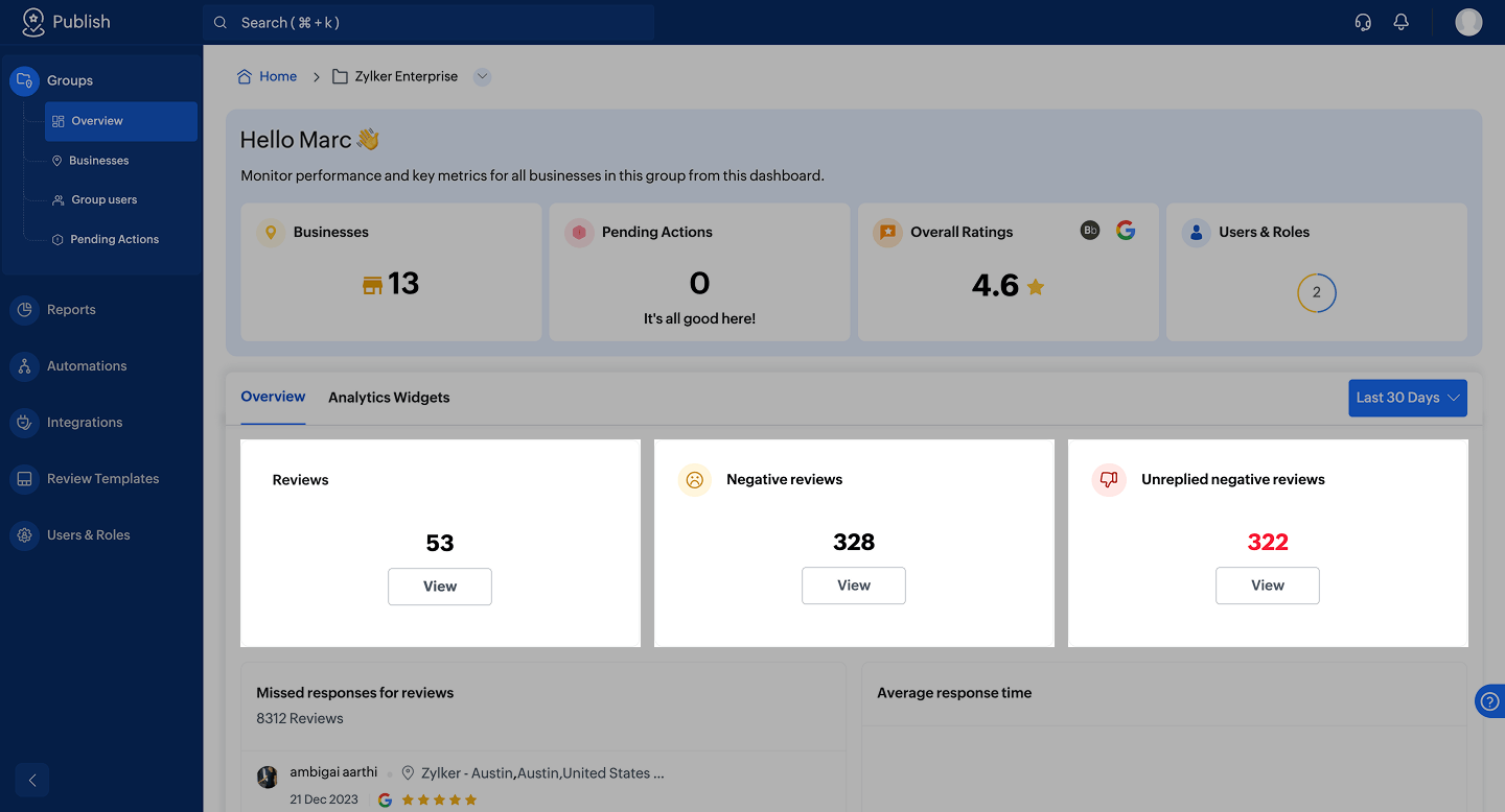 Missed responses for reviews list the actual reviews (with customers' names, ratings, and messages) that lack a response. A thoughtful and prompt response to reviews shows that a business is taking feedback seriously. You can navigate to each review and respond to them manually or with review templates.