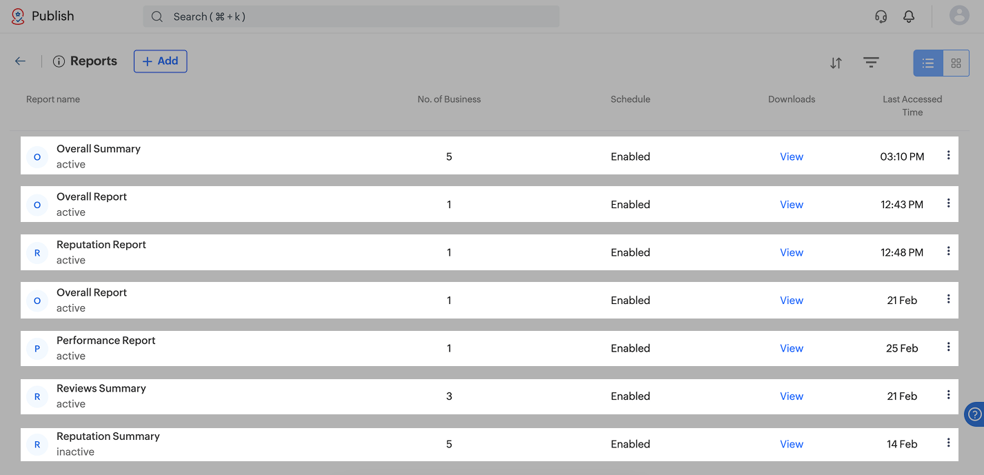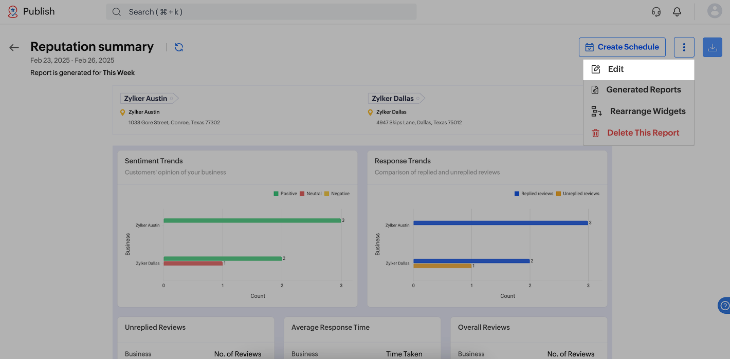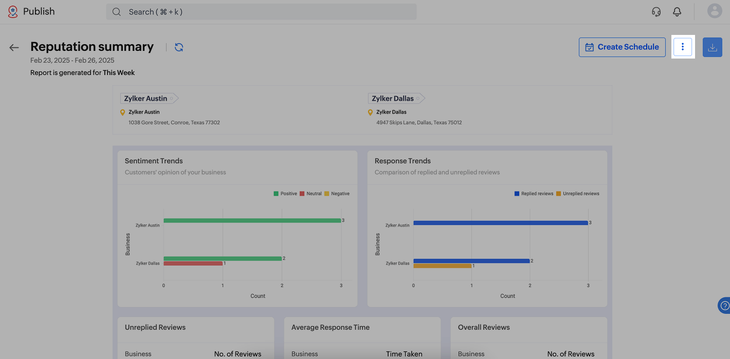 The Reputation Report in Zoho Publish closely analyzes incoming reviews and your responses. It highlights the number of reviews without a response, categorized by negative, neutral, or positive sentiments, along with rating distribution. This offers ...