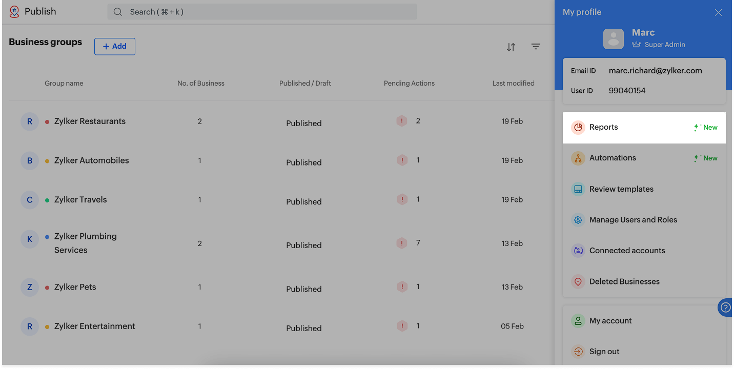 The Overall Report in Zoho Publish provides a detailed analysis of customer actions over a selected time period. It offers in-depth insights into reviews and how each business location handled them, along with data on customer actions like phone ...