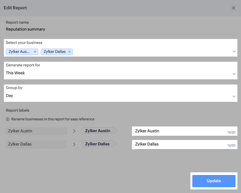 You can edit a report to match your needs by adding or removing businesses, adjusting the data timeframe, updating business labels, and more.