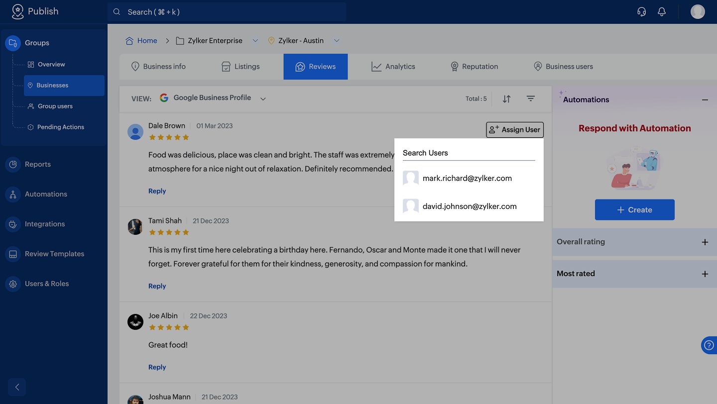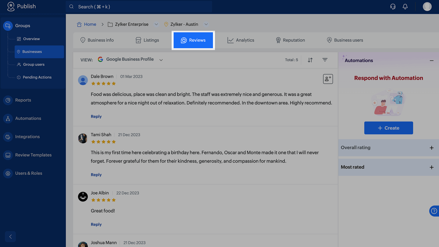 Responding to reviews, both positive and negative, shows that a business cares about customer satisfaction. This helps build trust and loyalty. Zoho Publish allows you to view all reviews and respond to them. You can set up review templates and use ...