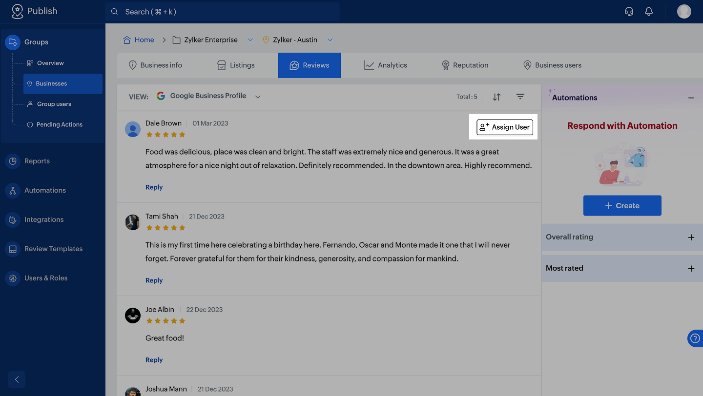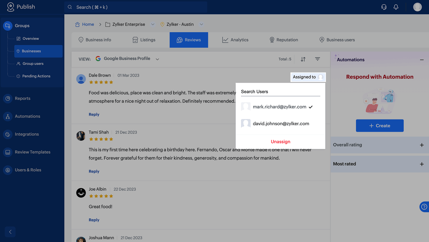 Responding to reviews thoughtfully helps build trust. For negative reviews, a personalized response works better than a generic apology. Assigning the review to the right person—someone experienced and familiar with the situation—ensures a better response.