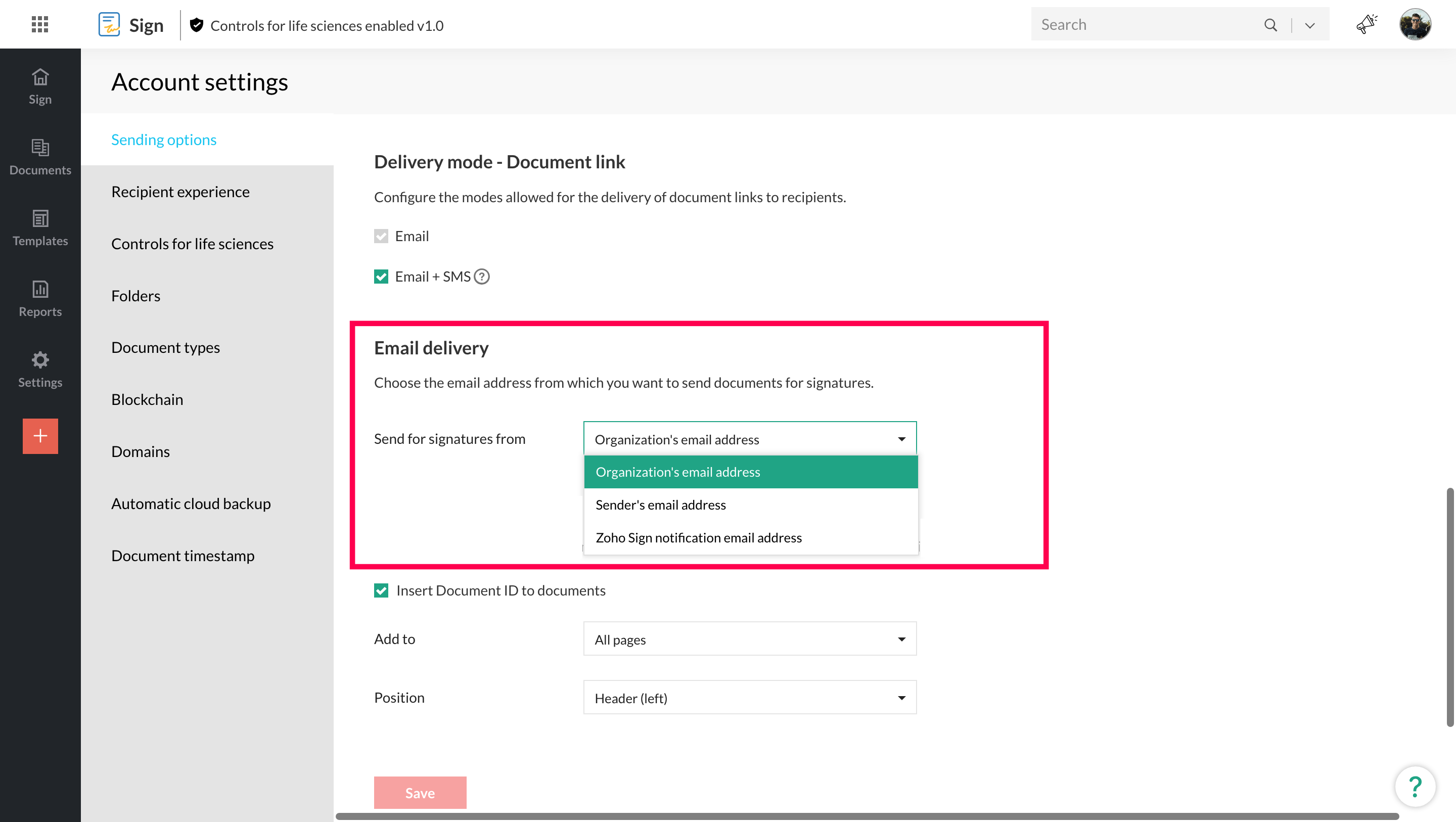 You can decide or specify the email address documents need to be sent out from for signatures in Zoho Sign. You can choose to send documents from your organization's email address, from the sender's email address, or from Zoho Sign's default notification email address.