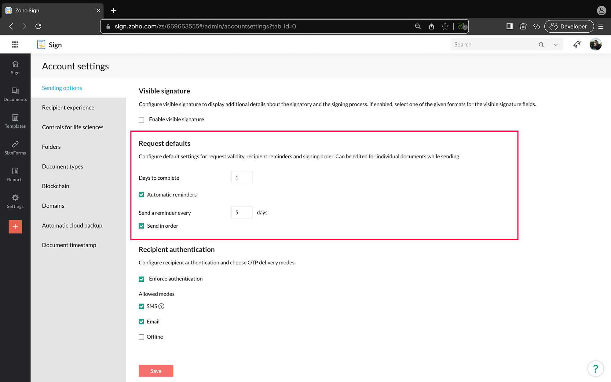 3. Days to complete: Specify the default timeframe in days allotted for the signer to finalize the signing action.