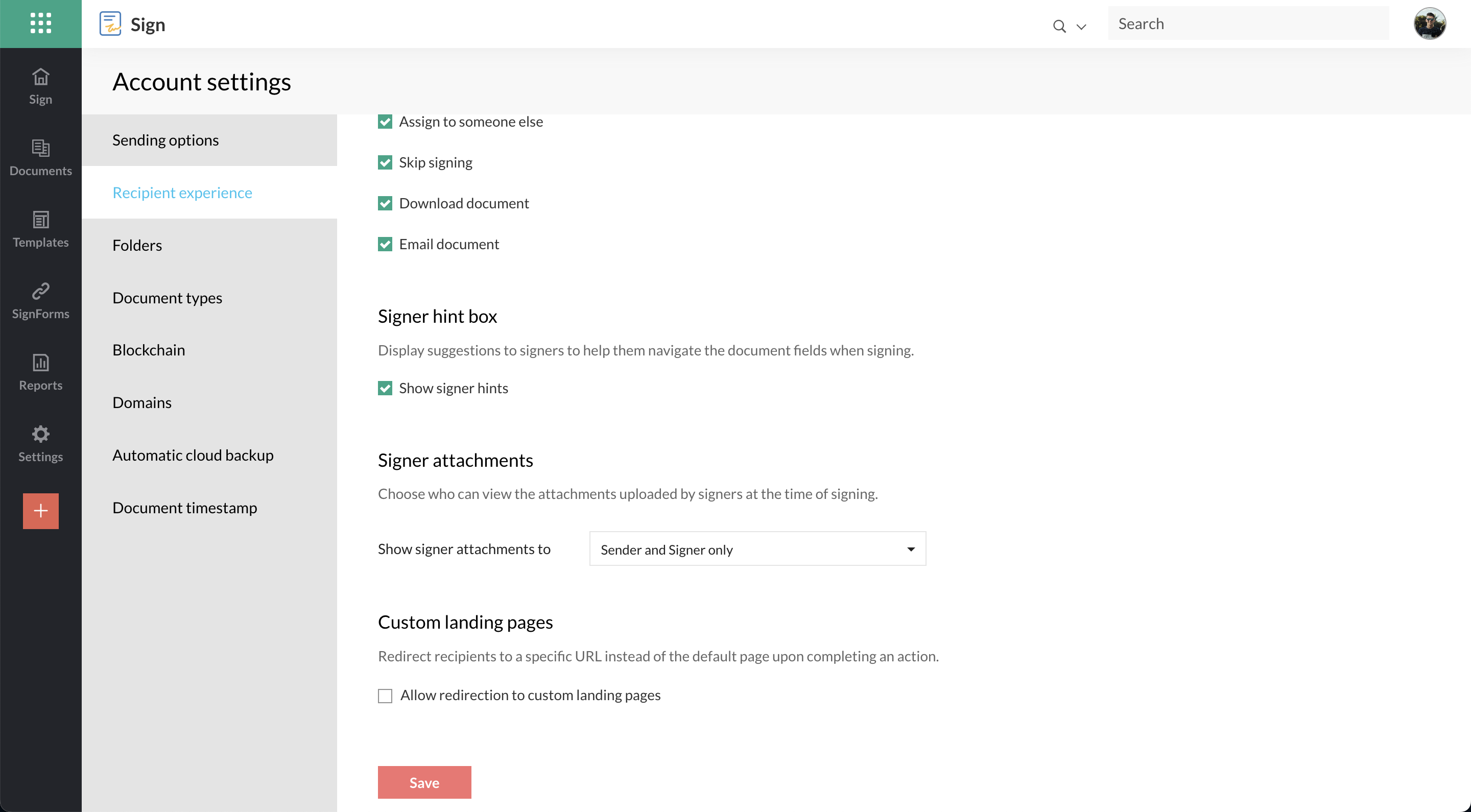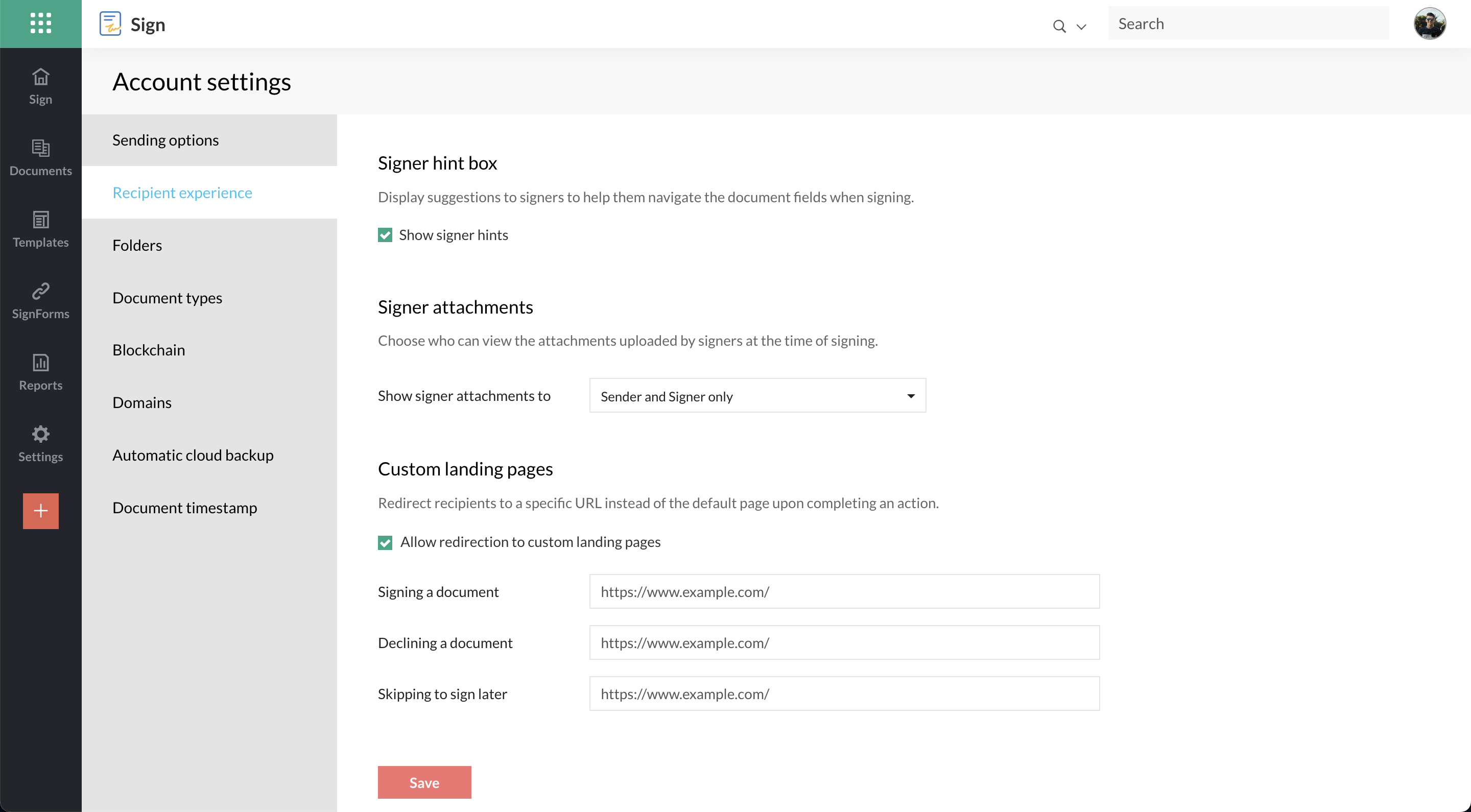 Provide a better signing experience for your signers with custom landing pages. This feature allows you to redirect signers to a specific URL after they sign the document.