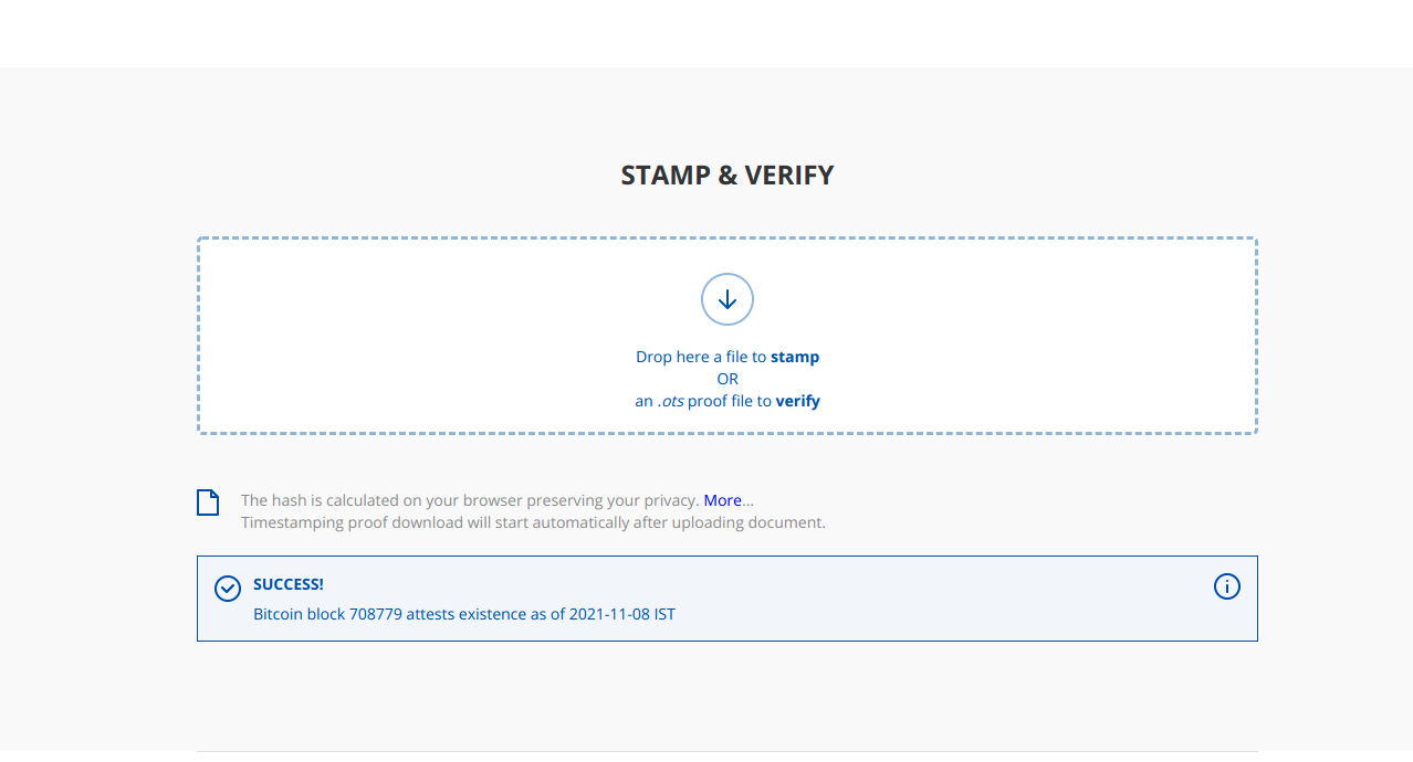 Once the hash has been generated, you can see if it matches the hash of the document retrieved from the blockchain transaction details. If the hashes match, then the signing of the document at the recorded time is taken to be verifiably true.