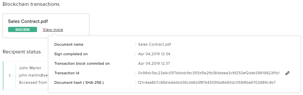 - Upon the completion of the Bitcoin transaction, the transaction block is added to the blockchain and the status of the transaction changes to SUCCESS in the document details page. Is transaction ID and transaction commit time, the associated document's sign completion time, and document hash (SHA-256) can be viewed by clicking View more.