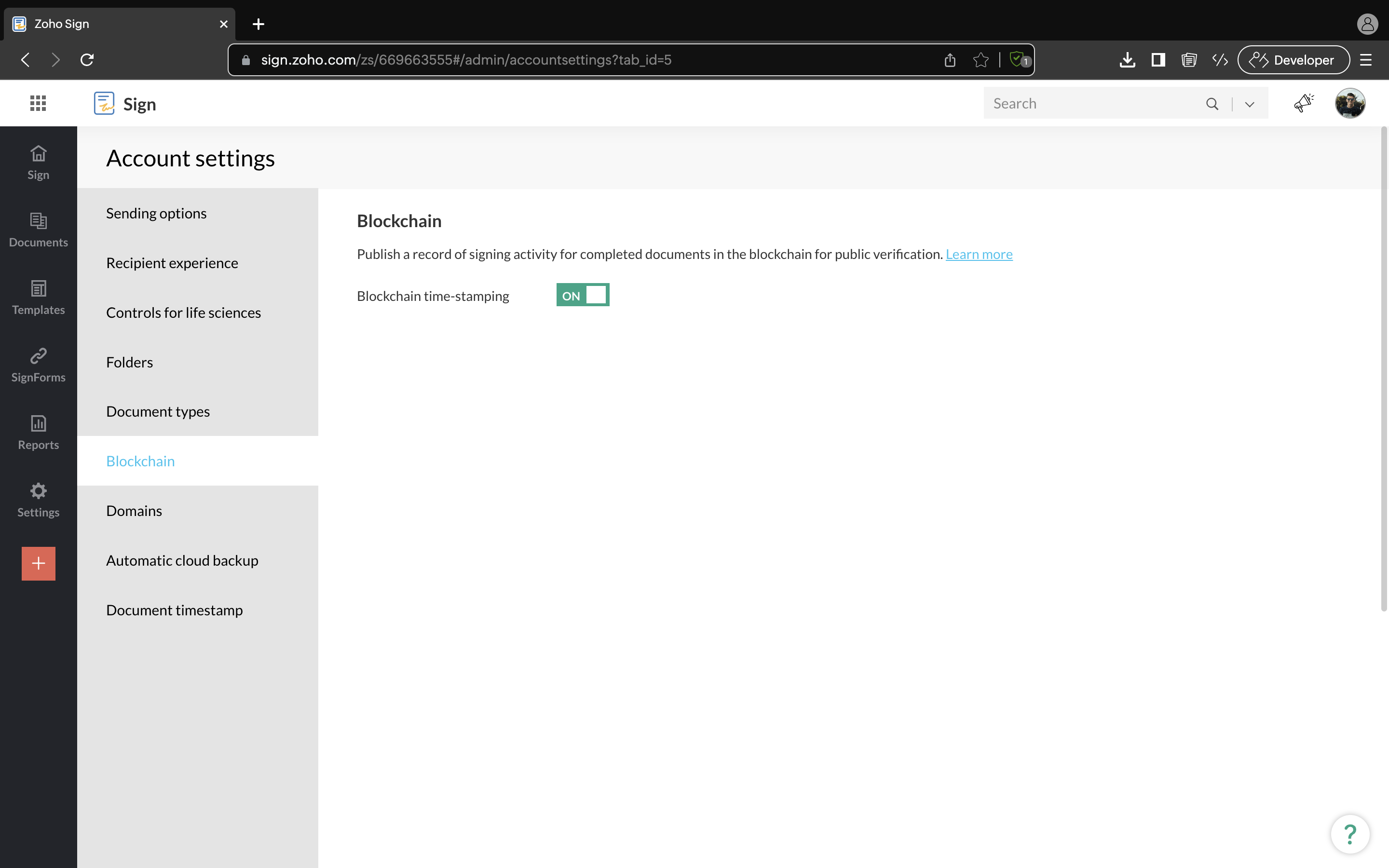 - Click the Blockchain tab and toggle Blockchain time-stamping to ON.