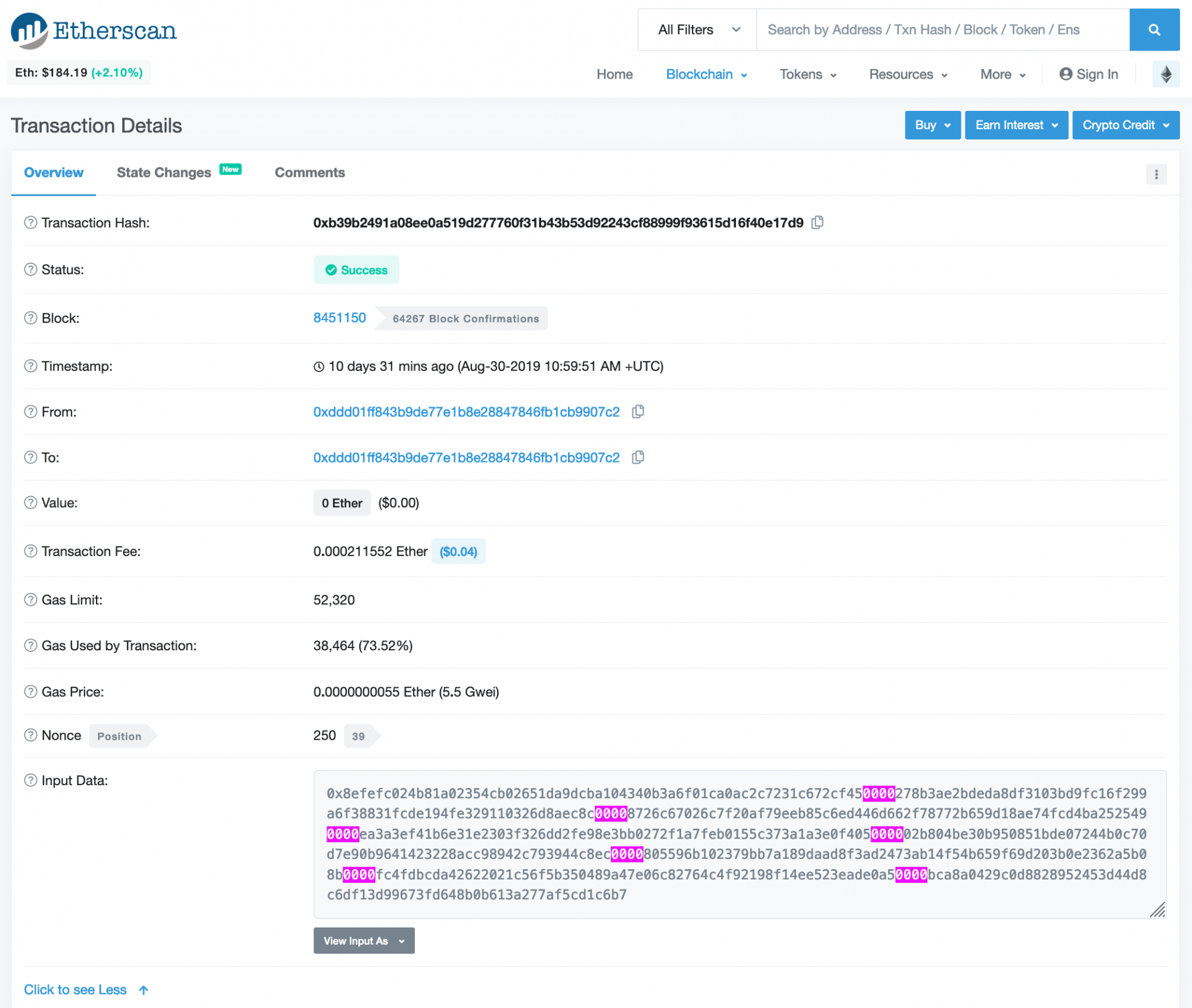 - Expand the Click to see more option to view the Input Data field. This field lists the aggregated document hashes, each separated by 0000, added to the data field of that transaction block.